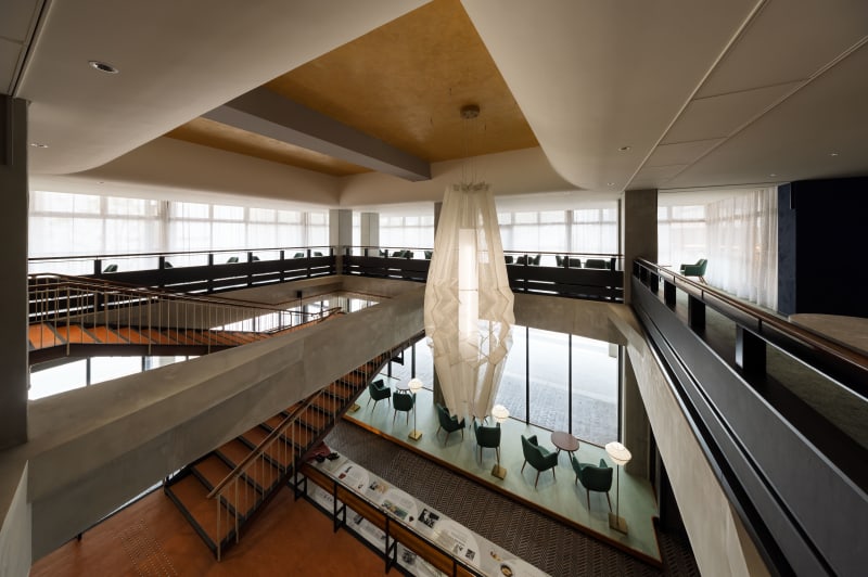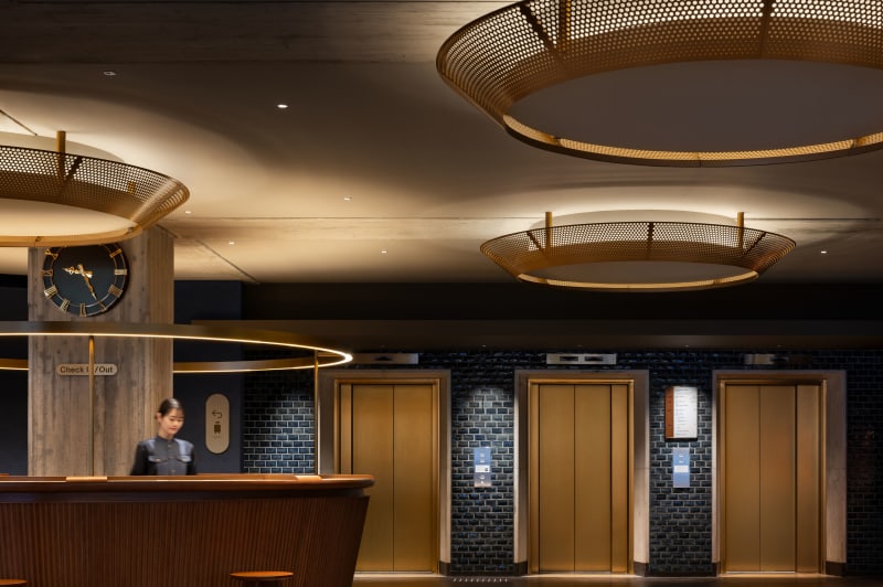 村野藤吾建築である旧議会棟本会議場の円形照明を再解釈した照明がエントランスを彩り、思わず高揚感が高まります。