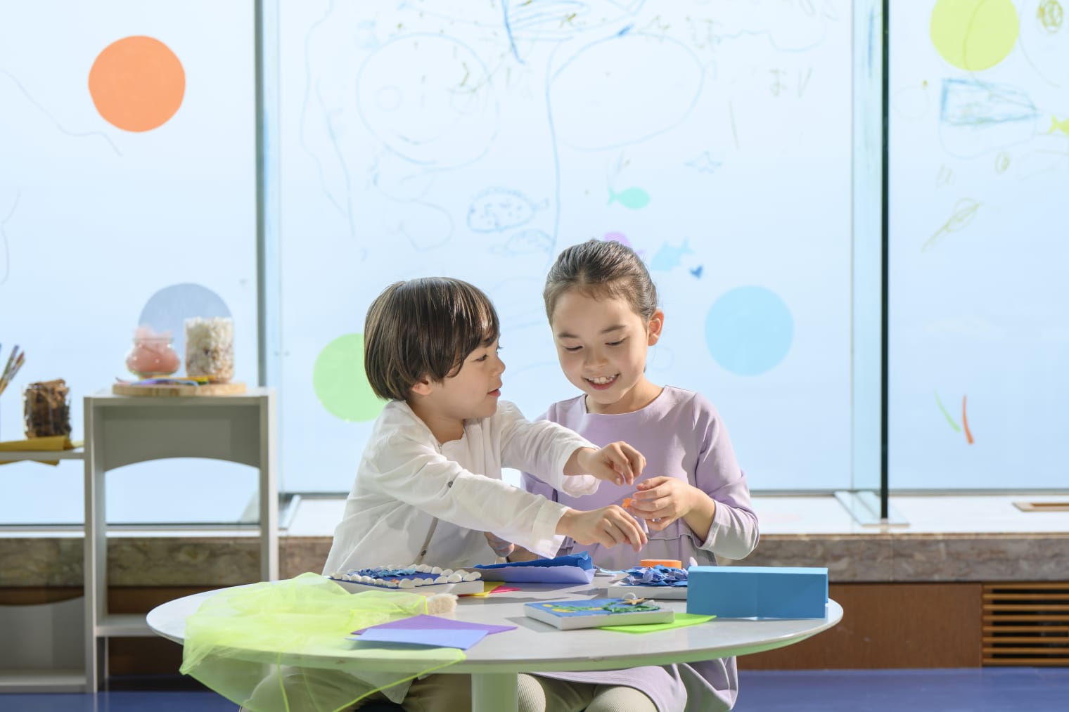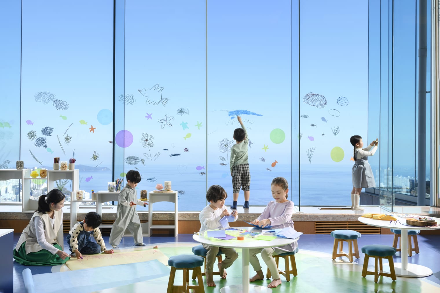 夢中になって遊びこむクラフト創作体験エリア。 ラボアシスタントがお子様の興味や知的好奇心を引き出しながら、自由に海のいきものを表現するアクティビティ。
