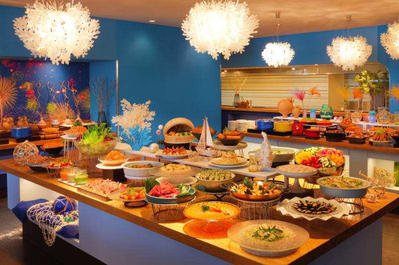 和食と洋食、バラエティ豊かに取り揃えております。目の前でシェフが焼くライブキッチンも。