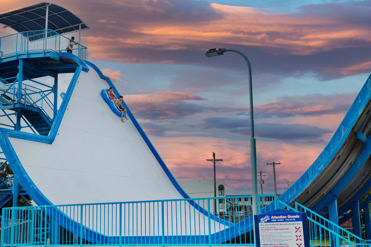 12mもの高さから浮き輪に乗り、垂直に急速落下する人気アトラクション。明るい日中とは異なる、夜の絶叫体験をお楽しみください。