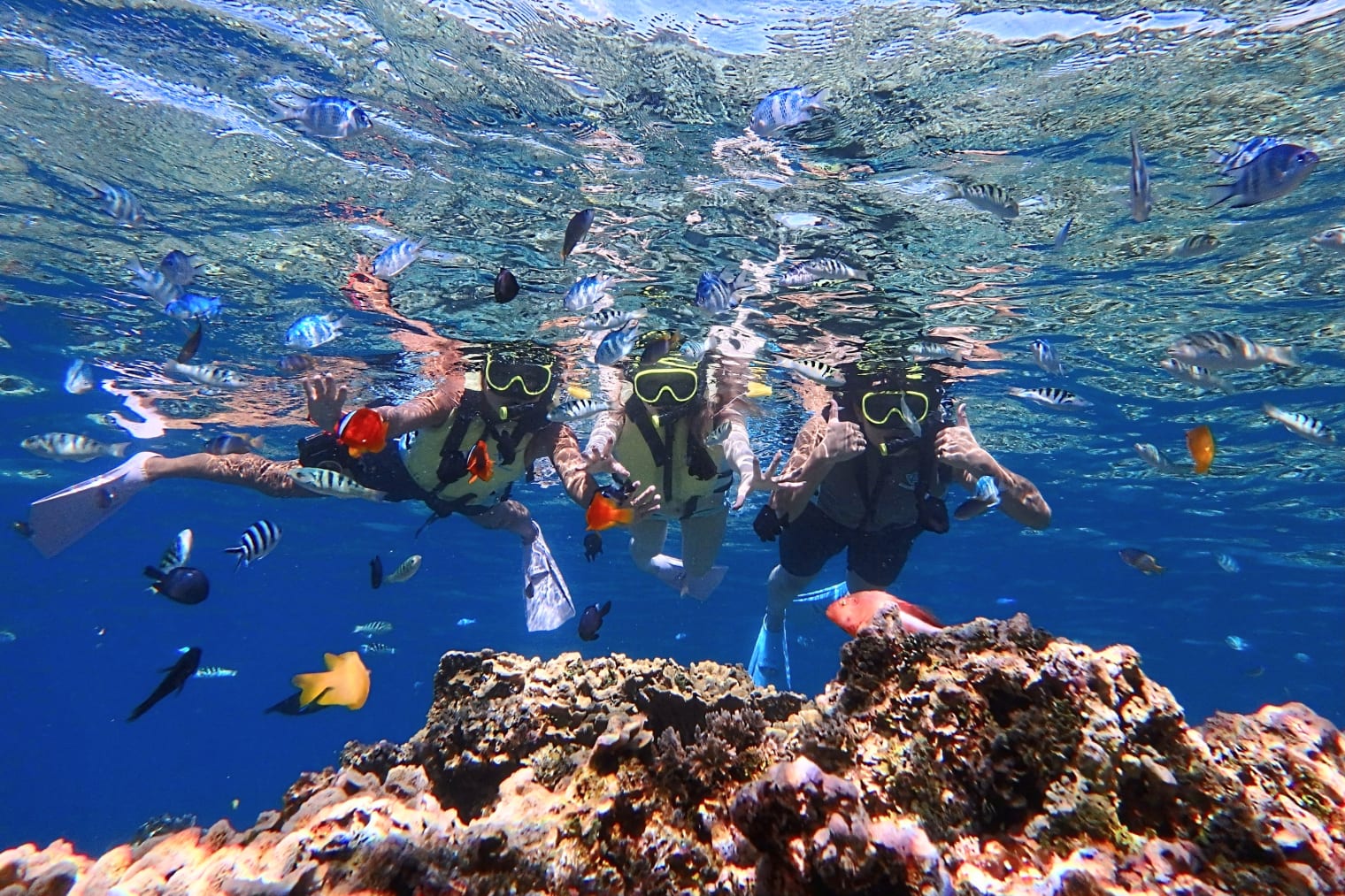 抜群の透明感を誇る2カ所のシュノーケリングポイントに行き、カラフルな熱帯魚やサンゴを観察します。(※パナリ島には上陸しません)