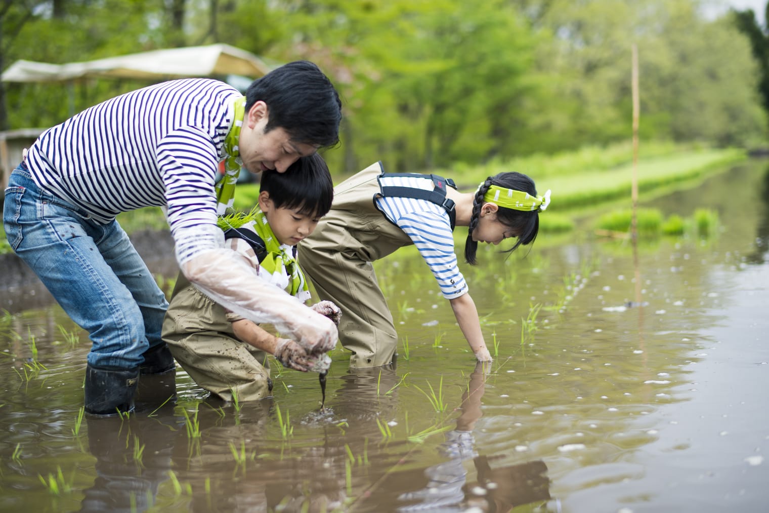 田植えから稲刈り、羽釜で炊いて食べるまでのお米の一生を体験できる「お米の学校」。季節ごとに移り変わる田んぼの景色の中で、手作業での稲作体験ができます。