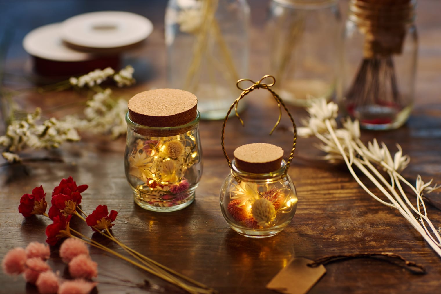 季節のドライフラワーを組み合わせたランタンづくり。夜の散策やお部屋での寛ぎの時間に灯せば、揺らめく光と花々のシルエットが那須の夜を優雅に彩ります。