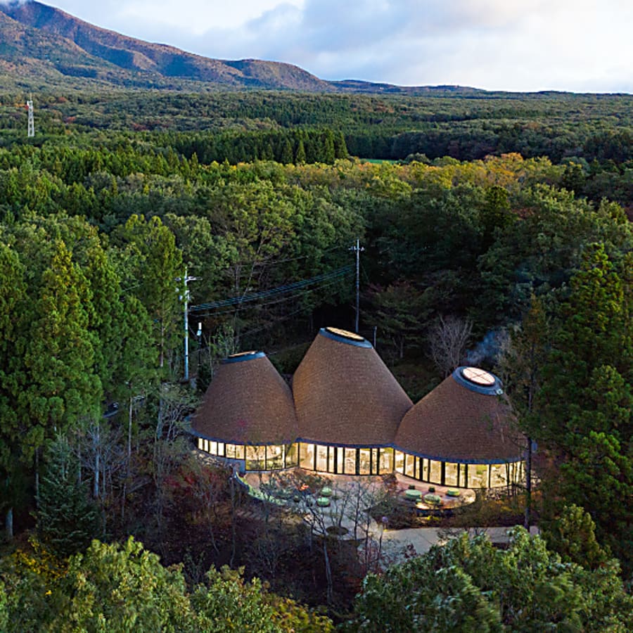一階にリビングスペース、二階にベッドルーム。緑を基調とした客室の天井まで高く伸びた大きな窓からは、那須の豊かな自然を一望できる客室もあります。