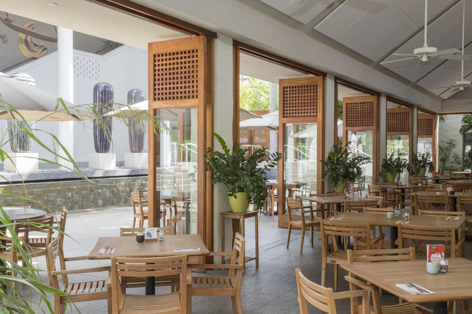 オープンエアの開放的なレストランで、地元産の新鮮な食材を使ったランチやケーキが楽しめます。金曜日の夜と日曜日のブランチは、生演奏やDJの音楽を聴きながらディナーやお酒も堪能できます。