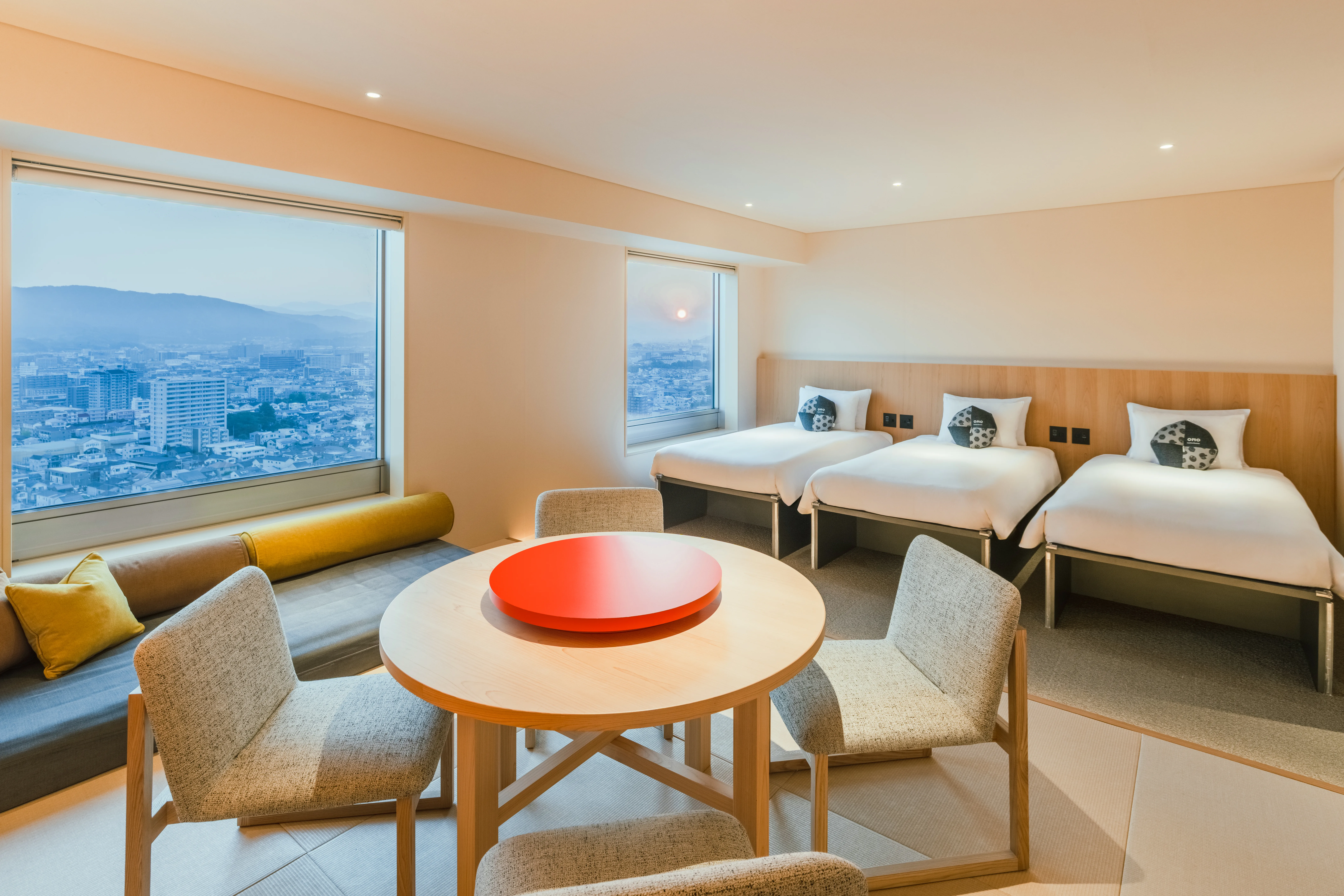 美しい眺望を望むリビングスペースには、⾊鮮やかな⼤⽫に盛られた高知の「皿鉢料理(さわちりょうり)」から着想を得た丸いテーブルを設置。円卓中央には高知の大皿料理「皿鉢(さわち)」をイメージした赤い台を配しており、高知の宴会文化「おきゃく」の雰囲気を演出しています。秋の夜のひとときに、お部屋でゆったりと宴会を楽しむのもおすすめです。