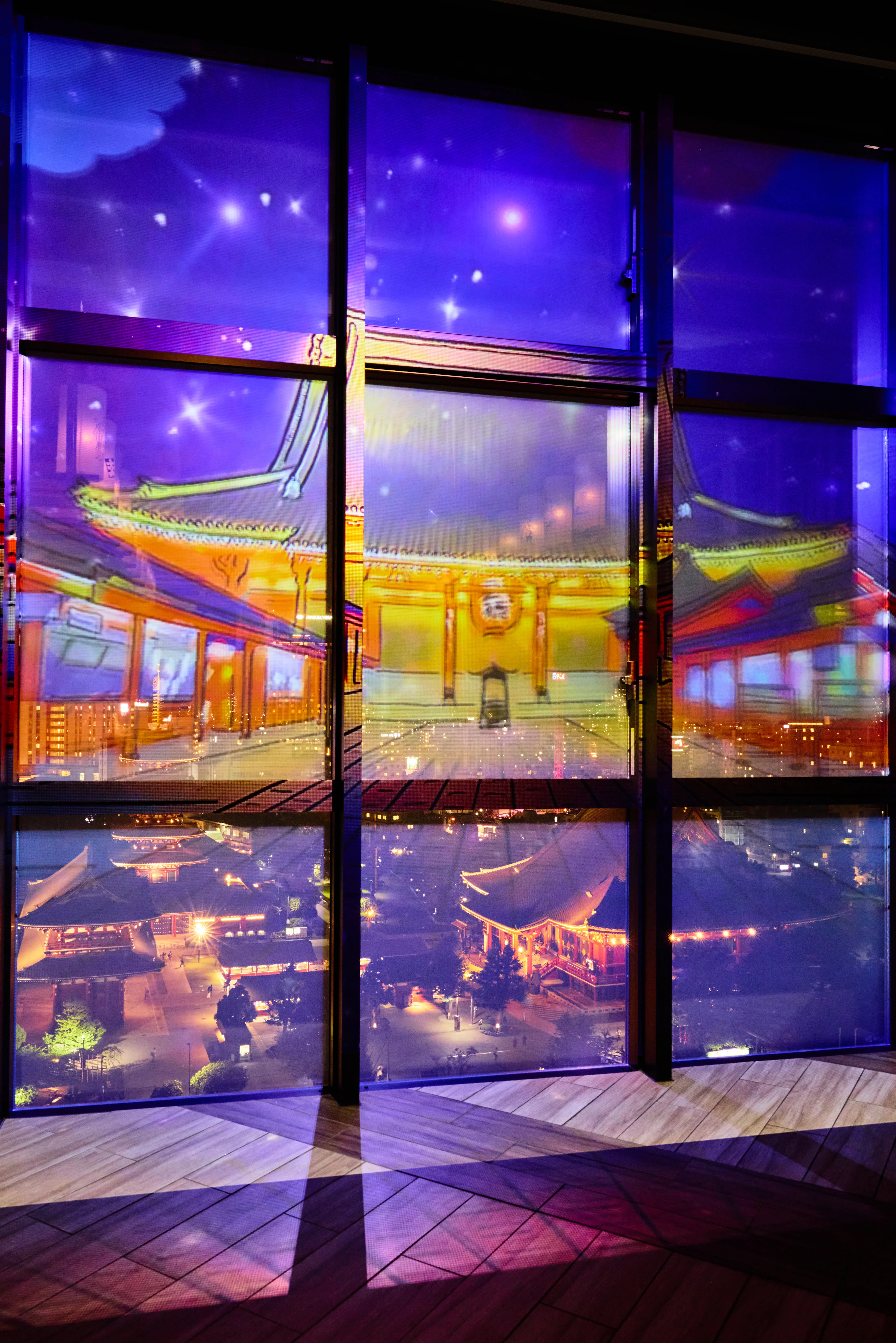 浅草の街に提灯の灯りがともる頃、パブリックスペース「OMOベース」でも、ずらりと並ぶ提灯がやさしく輝き始めます。 夜のイベント「あさくさ宵見世」では、浅草寺の夜景を背景に、窓一面に浅草の歳時記をテーマにした映像が映し出され、夜景と映像が溶け合う幻想的な世界を楽しめます。さらに、浅草の歳時記を浮世絵風に描いた提灯や、浅草の名所をモチーフにした天井画など、浅草らしい“粋”が散りばめられた空間も必見です。