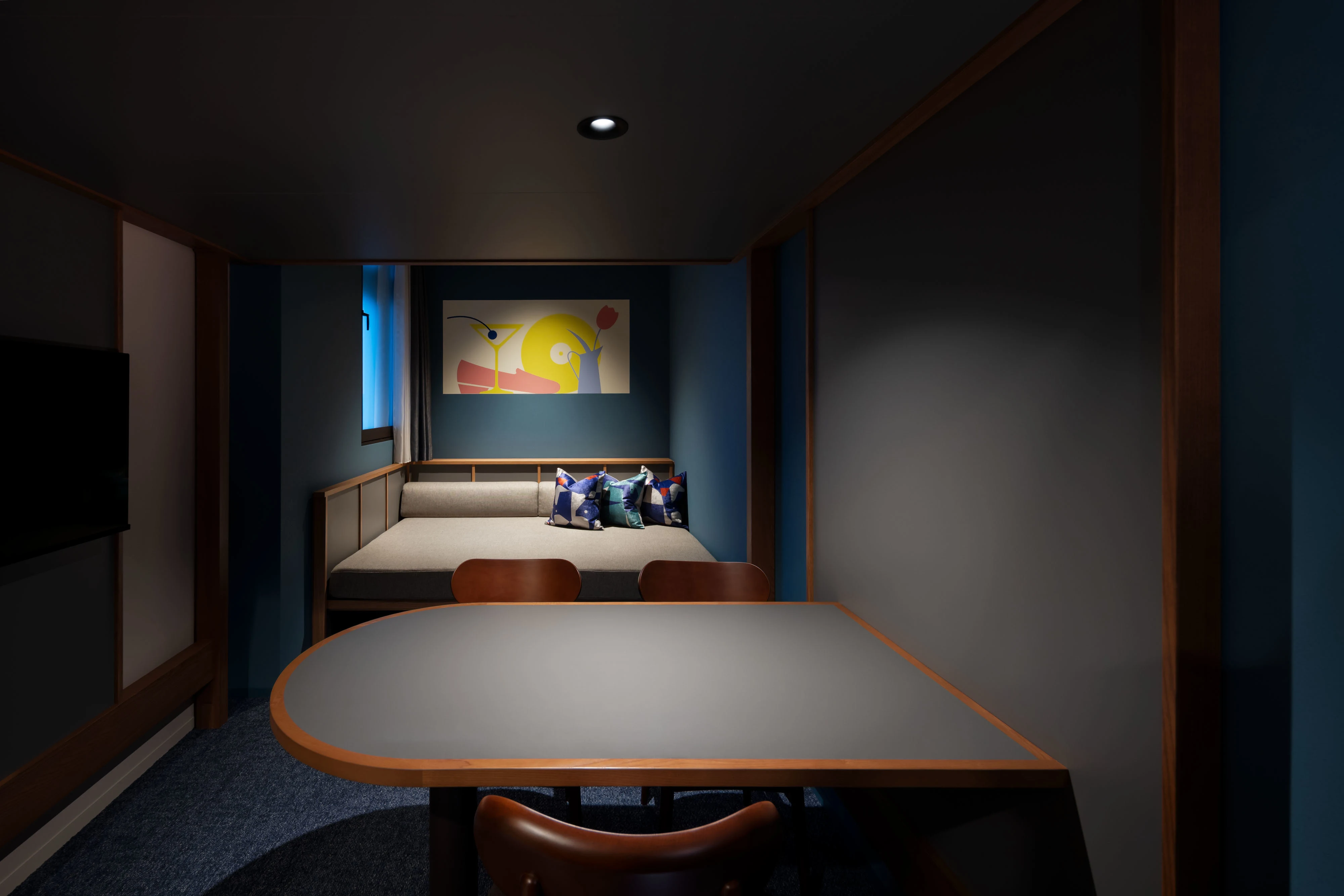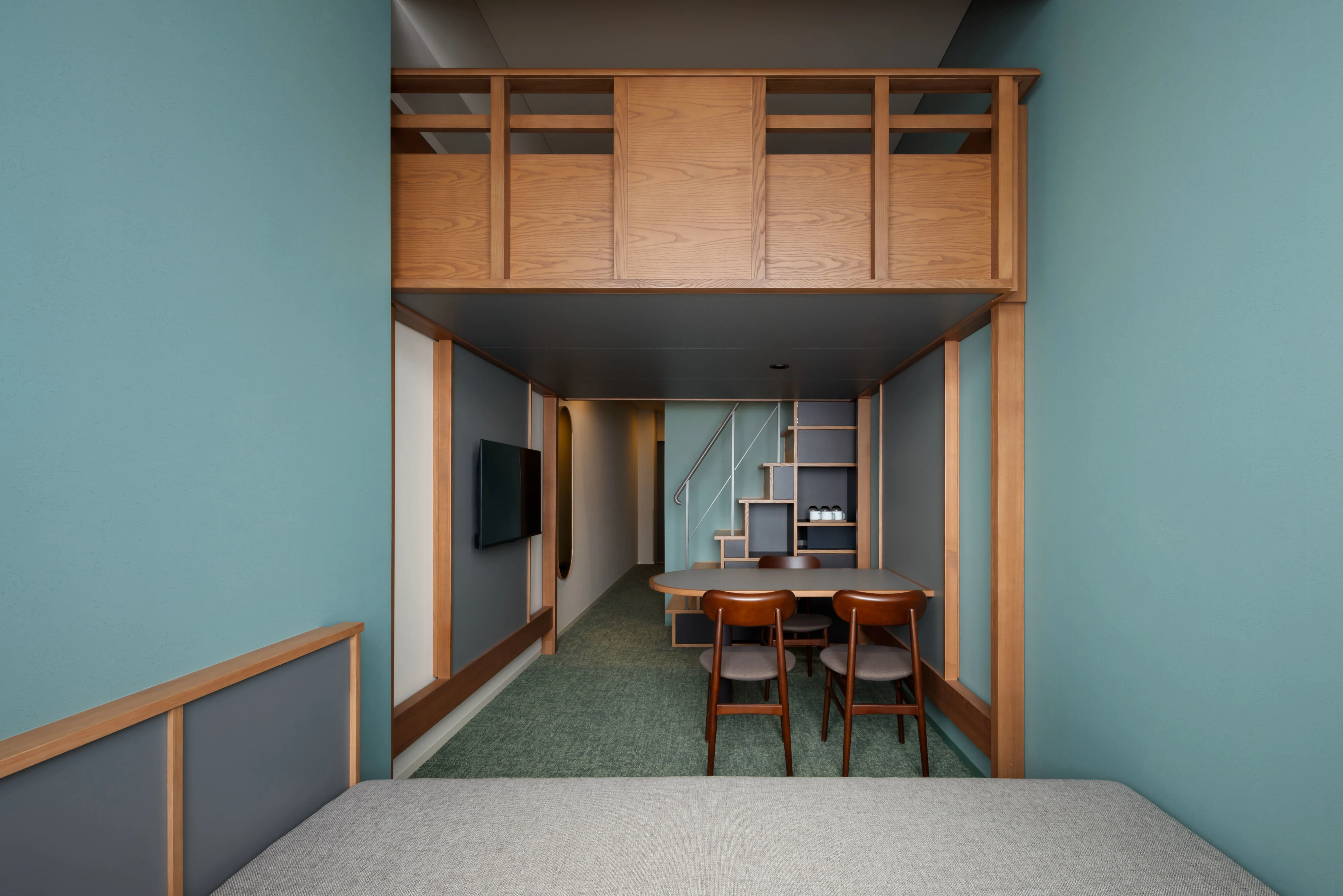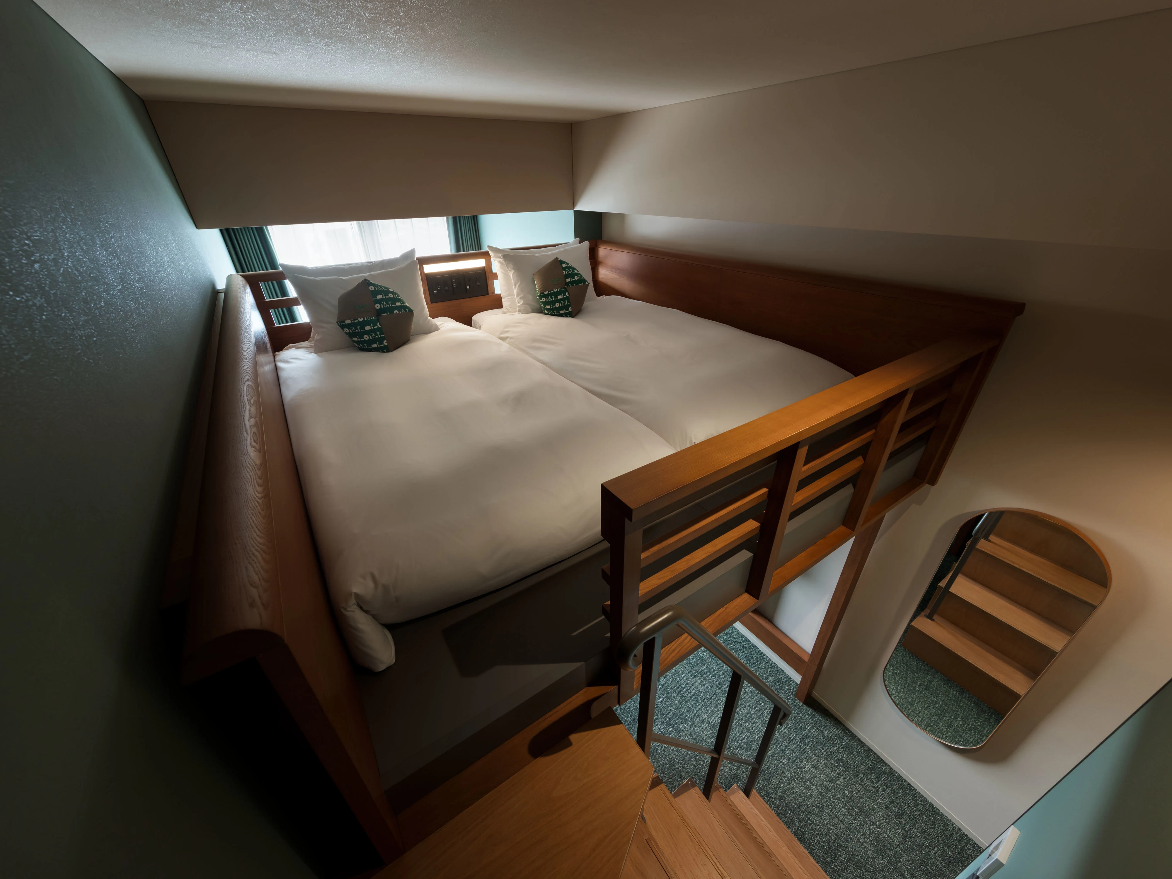 特徴的なやぐら寝台は、寝るまでの時間もホテルステイを最大限楽しめるスタイル。
