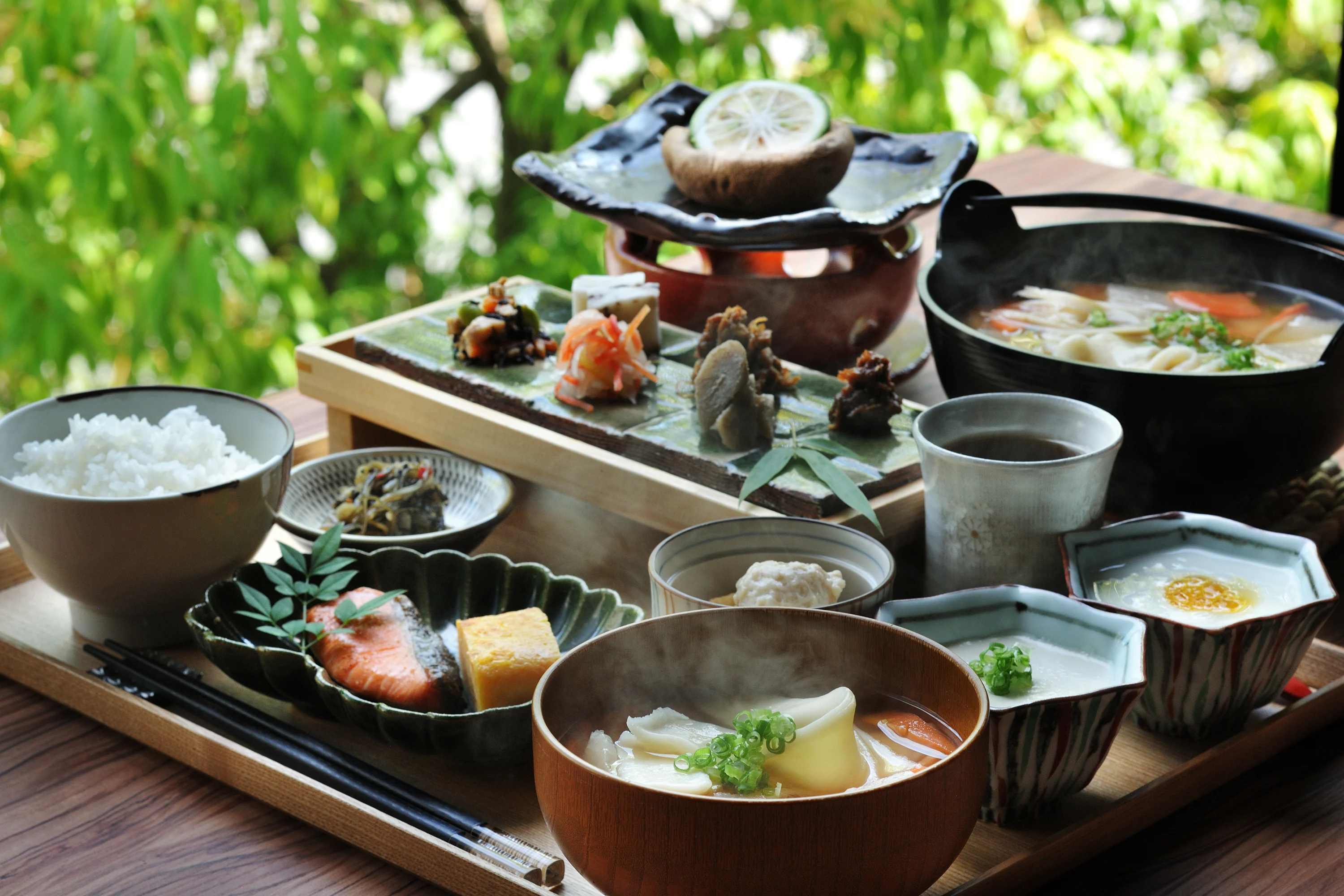 界 由布院では、大分名物のだんご汁や椎茸のかぼす焼きを中心とした和食膳をご用意しています。お好みに応じて洋朝食もお選びいただけます。