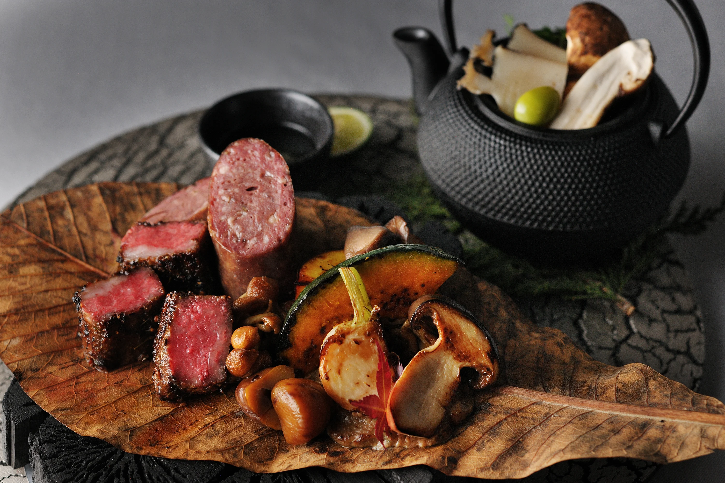 ダイニングで味わう「ガストロノミック・ワイルド」。秋のメニューでは、ジビエや松茸、山梨ワインが織りなす富士山麓の秋の味覚をお楽しみいただけます。
