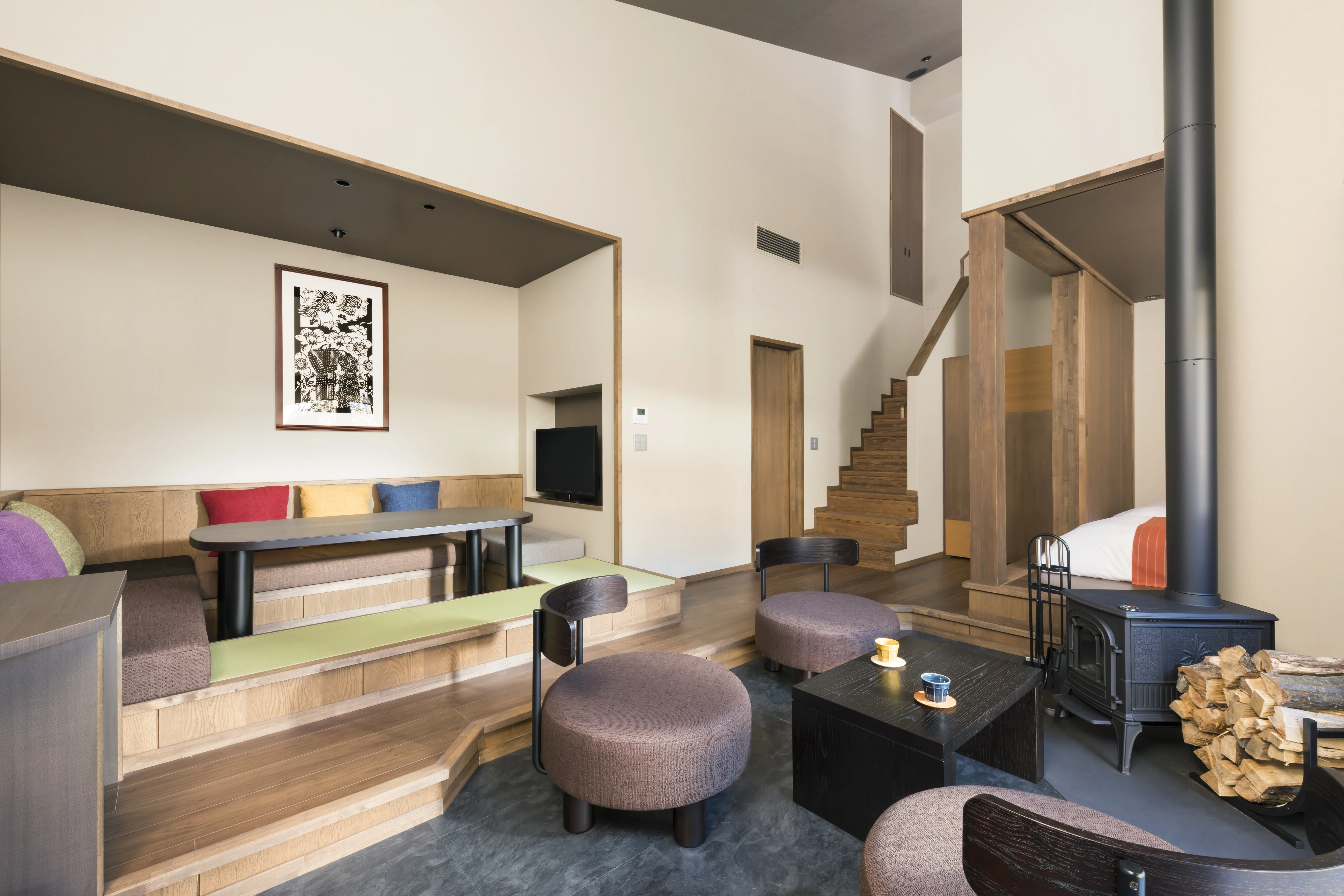 信州の自然をテーマにしたアートと松崎和紙の灯りにくつろぐご当地部屋「信濃もてなしの間」。 天井が高くロフトベッドを設えた「ロフト付き和室」や、更に薪ストーブも備えた「離れ」のご用意もございます。