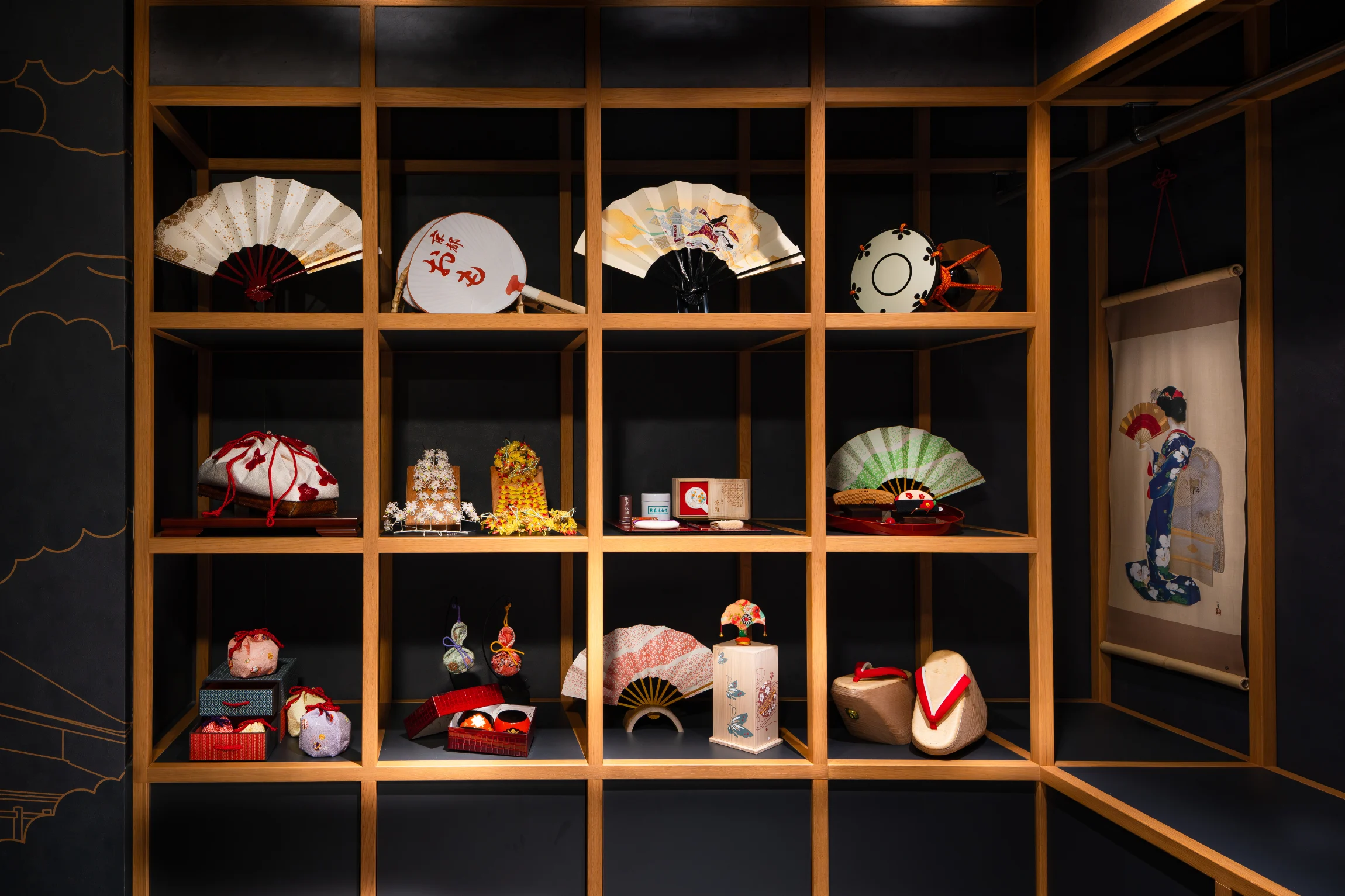 パブリックスペース・OMOベースにて毎晩開催される「祇園宵のおも茶話会」では、大きな提灯の装飾が目を引くお座敷のような空間が出現します。舞妓さんにちなんだ和菓子とスタッフが目の前で点てた抹茶を味わったり、普段はなかなか体験できないお座敷遊びをしてみたり、五感を通じて祇園の夜を楽しめます。