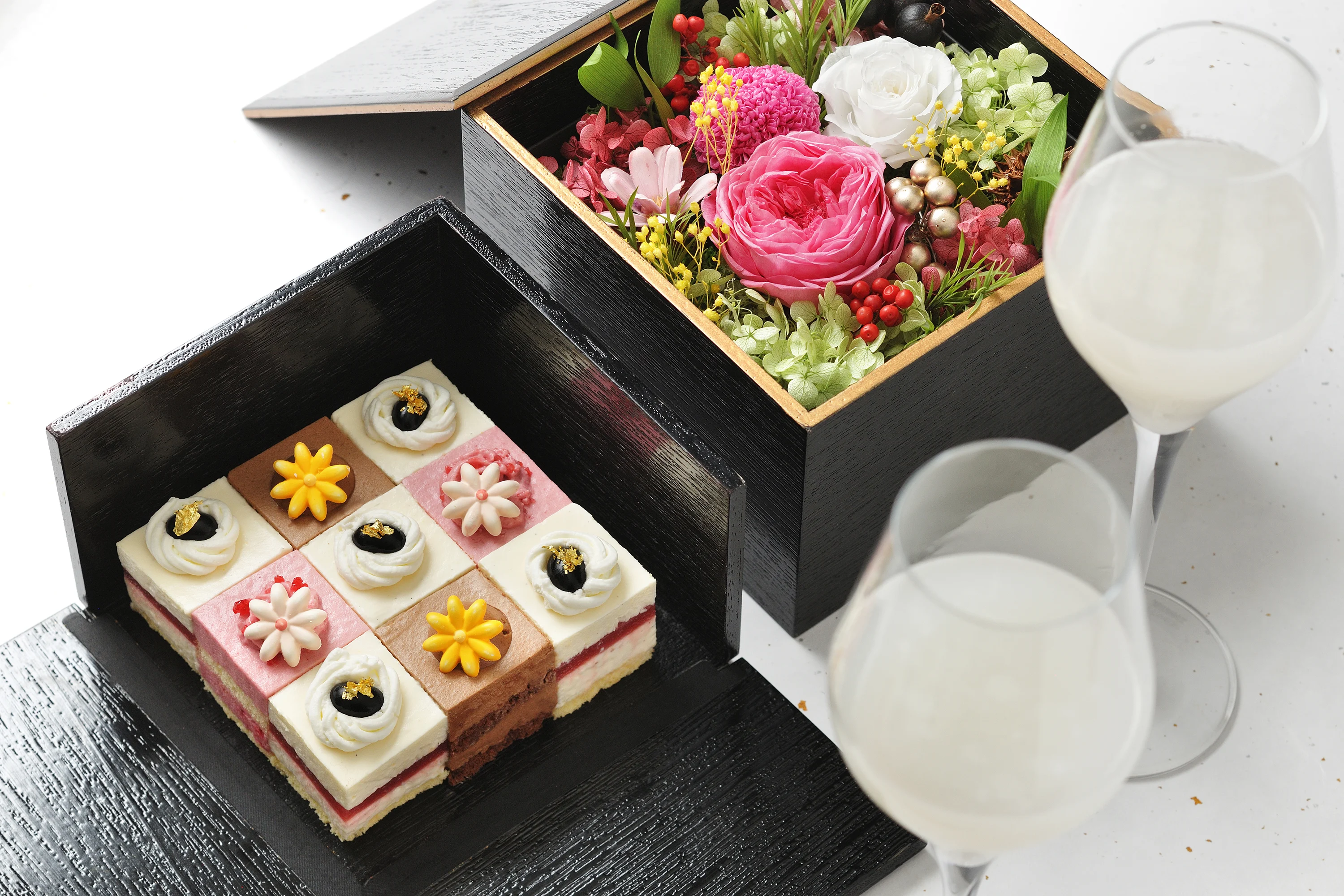 また、大切な日のお祝いの席には、プリザーブドフラワーとケーキをお重に詰めてセットにした、界オリジナルのお祝い箱もご用意しています。