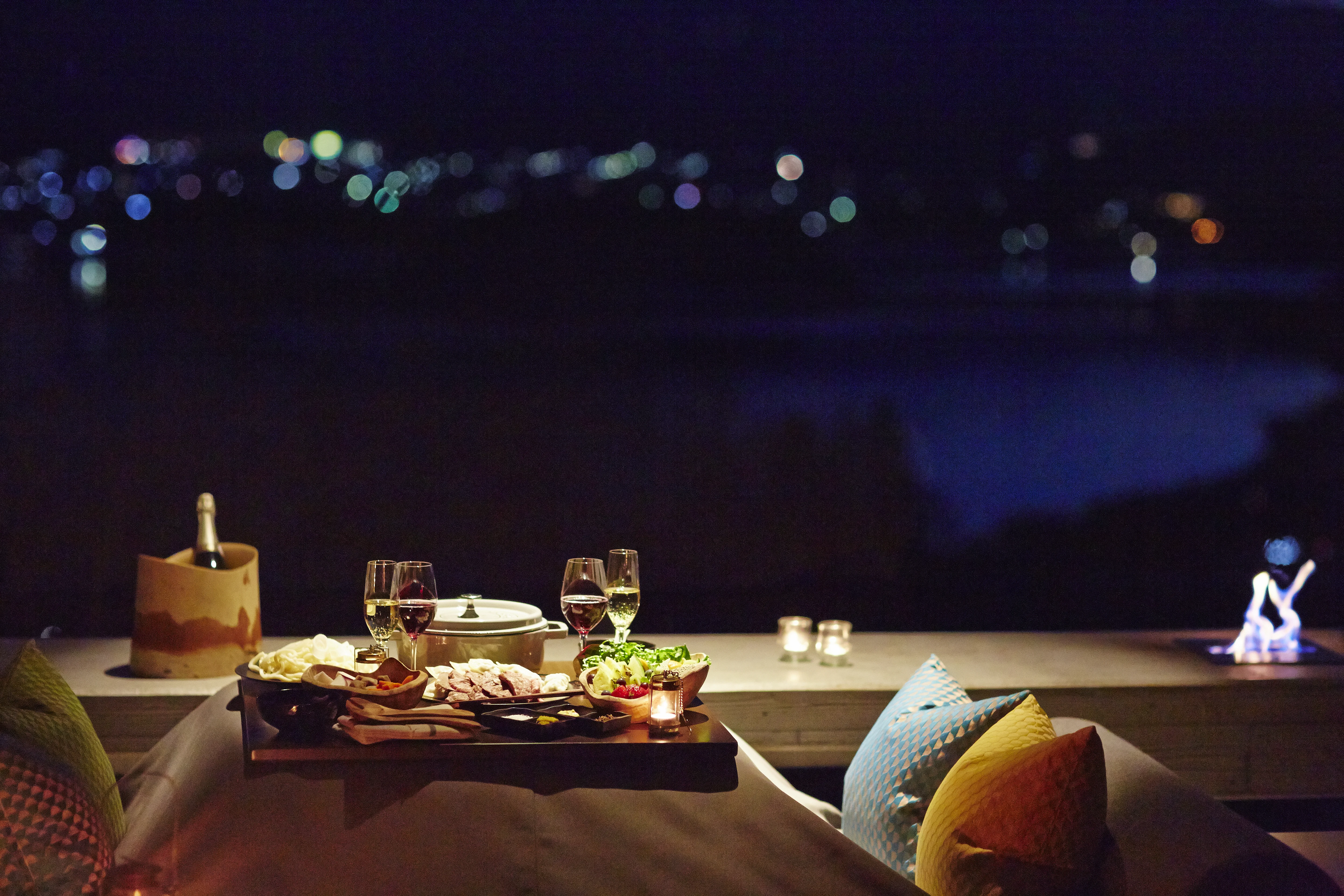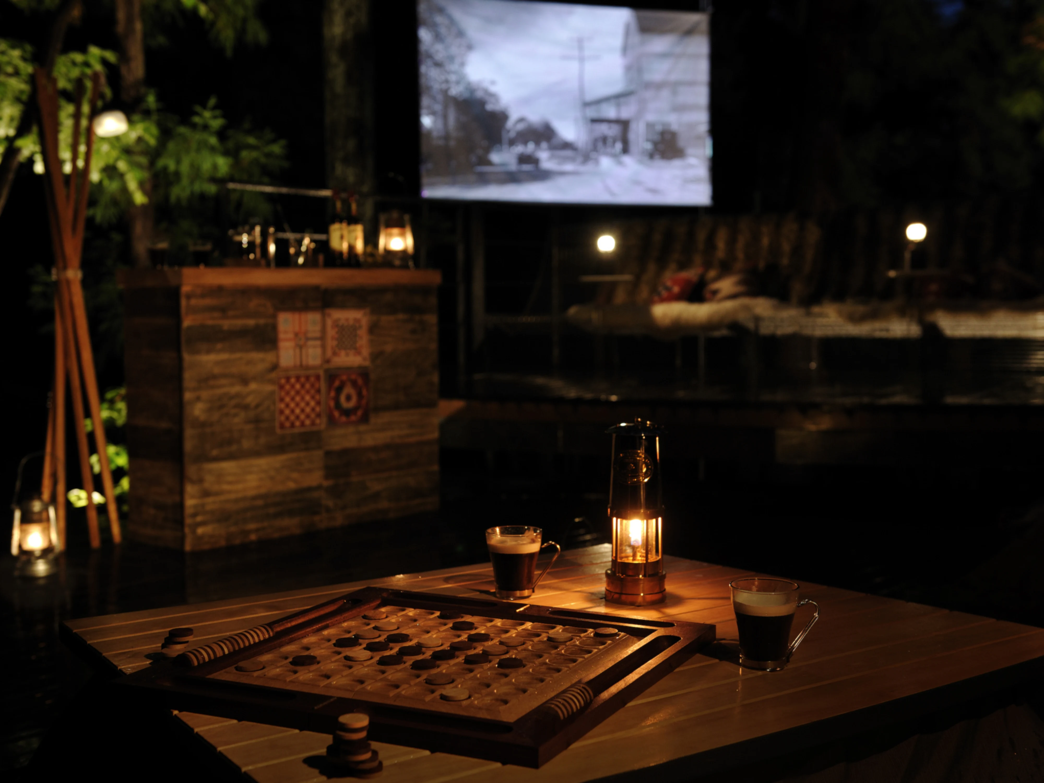 冬限定の「森ごもりラウンジ」は、澄んだ空気が漂う夜の森の中で、こたつに入ってゆったりとくつろげる空間です 。焚き火を眺めながら語り合ったり、ボードゲームで盛り上がったりと思い思いの時間を過ごせます。