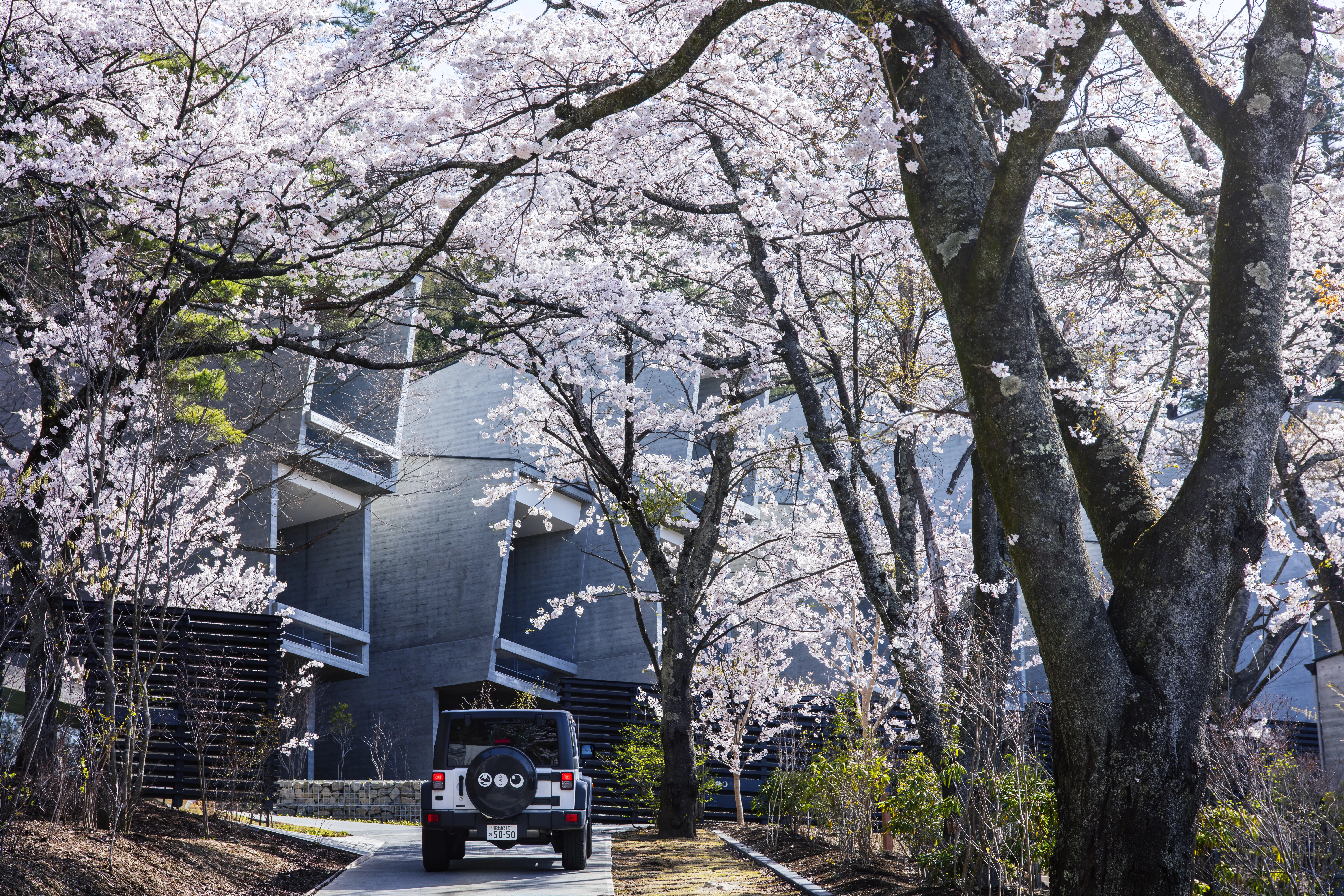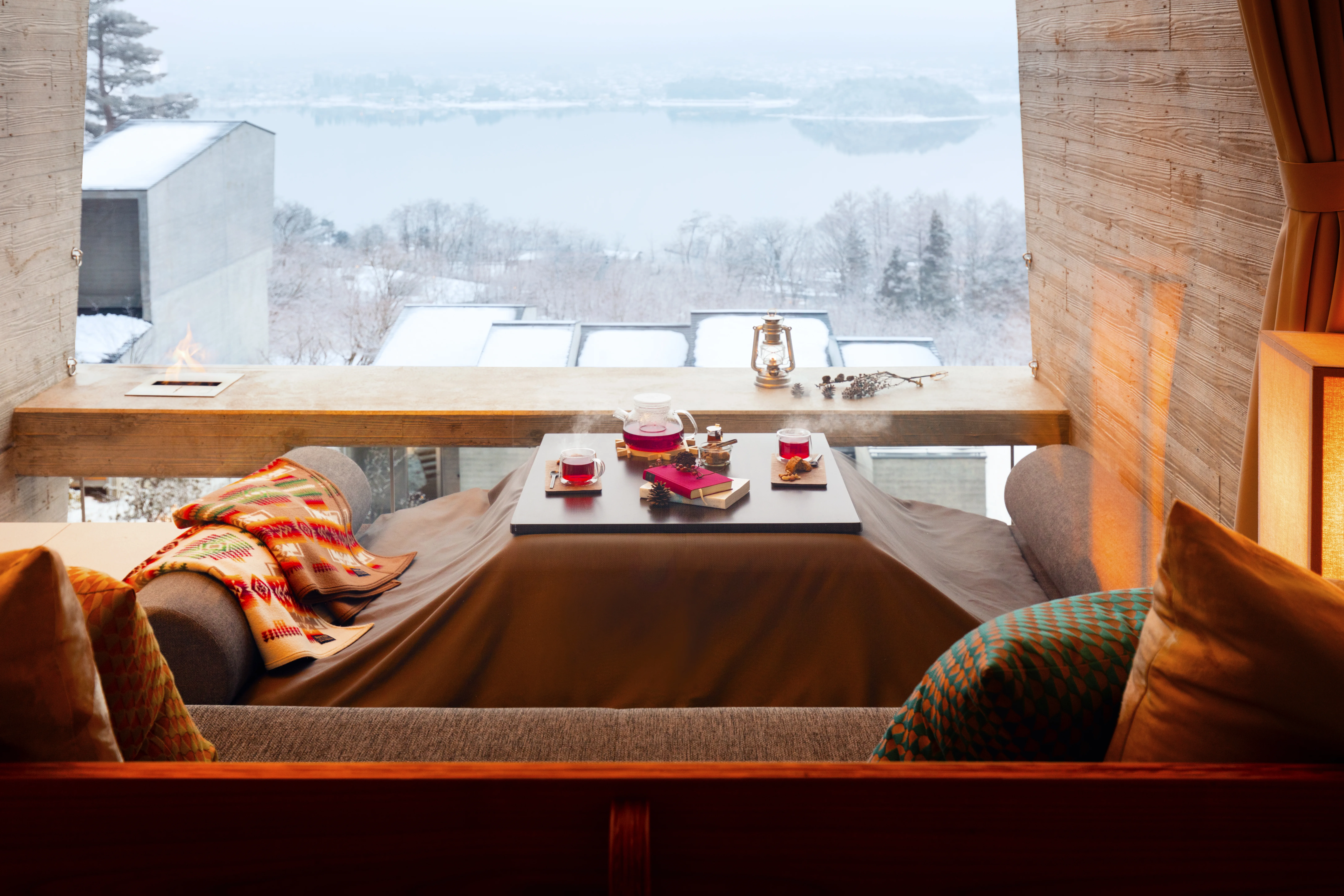 客室の扉を開けると、美しい山麓と湖の風景が目の中に飛び込んできます。春にはサクラ、夏には深緑、秋には紅葉、冬には雪景色と、室内にいながらも季節ごとに移り変わる風景を楽しめます。