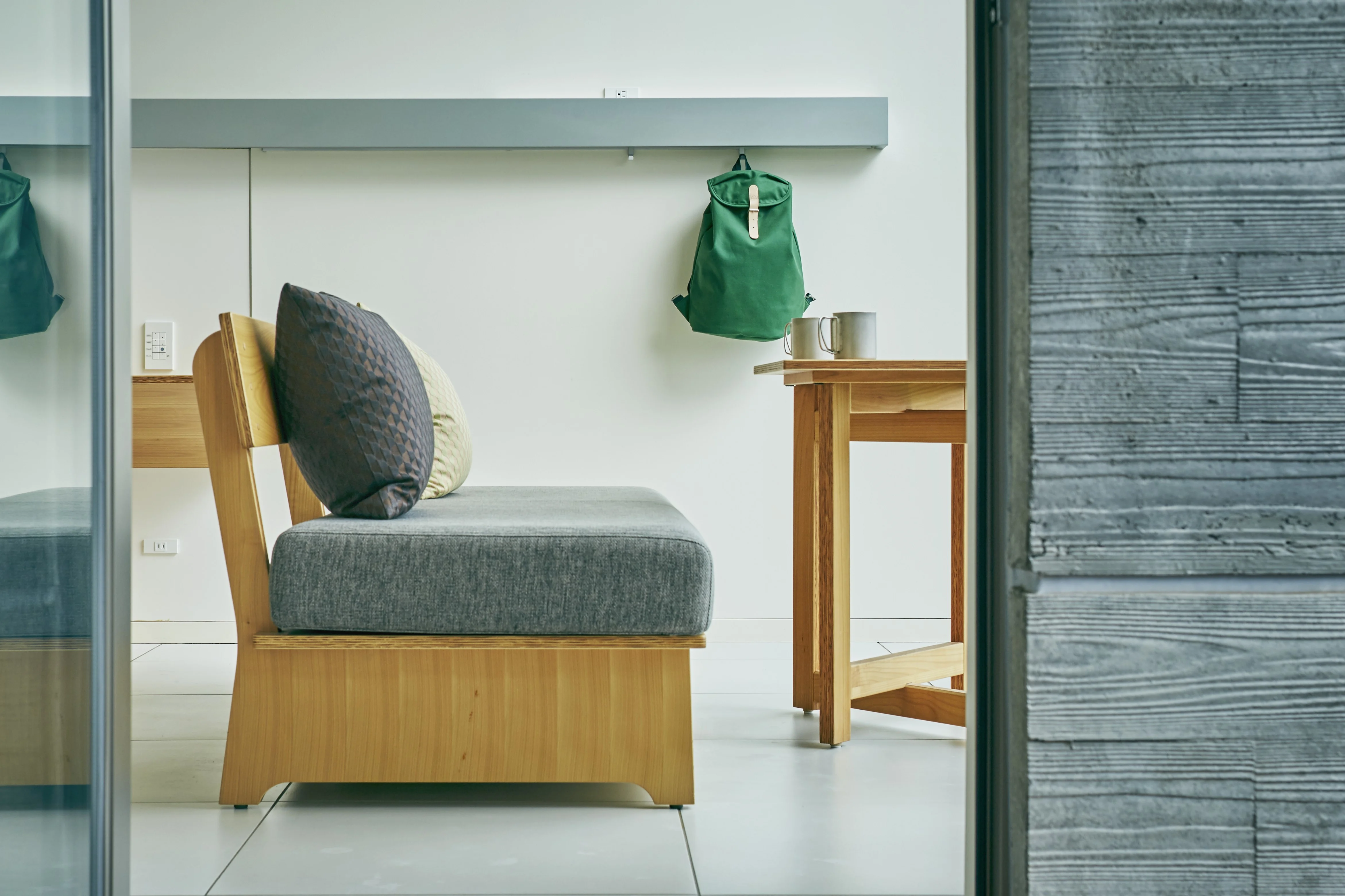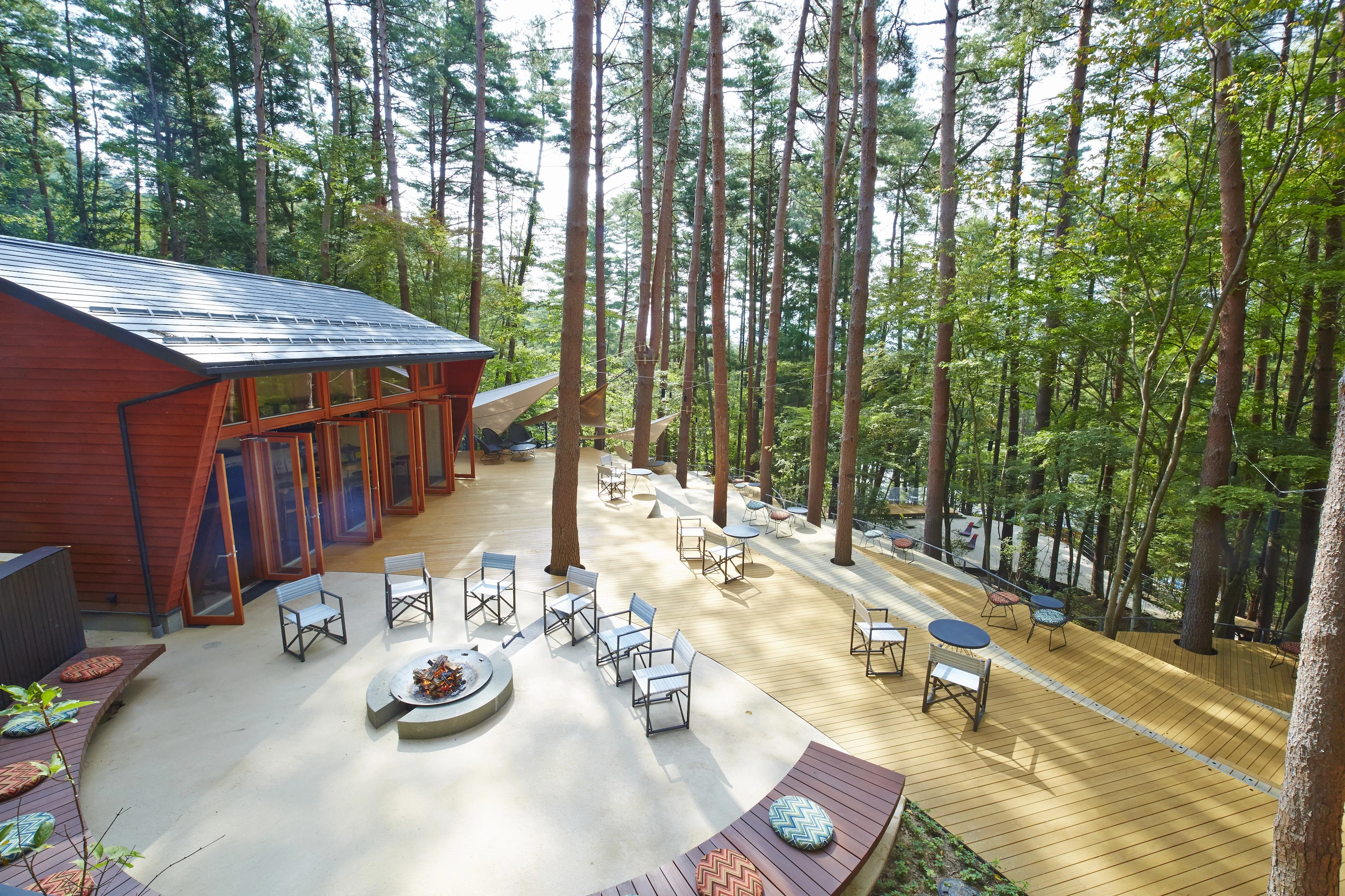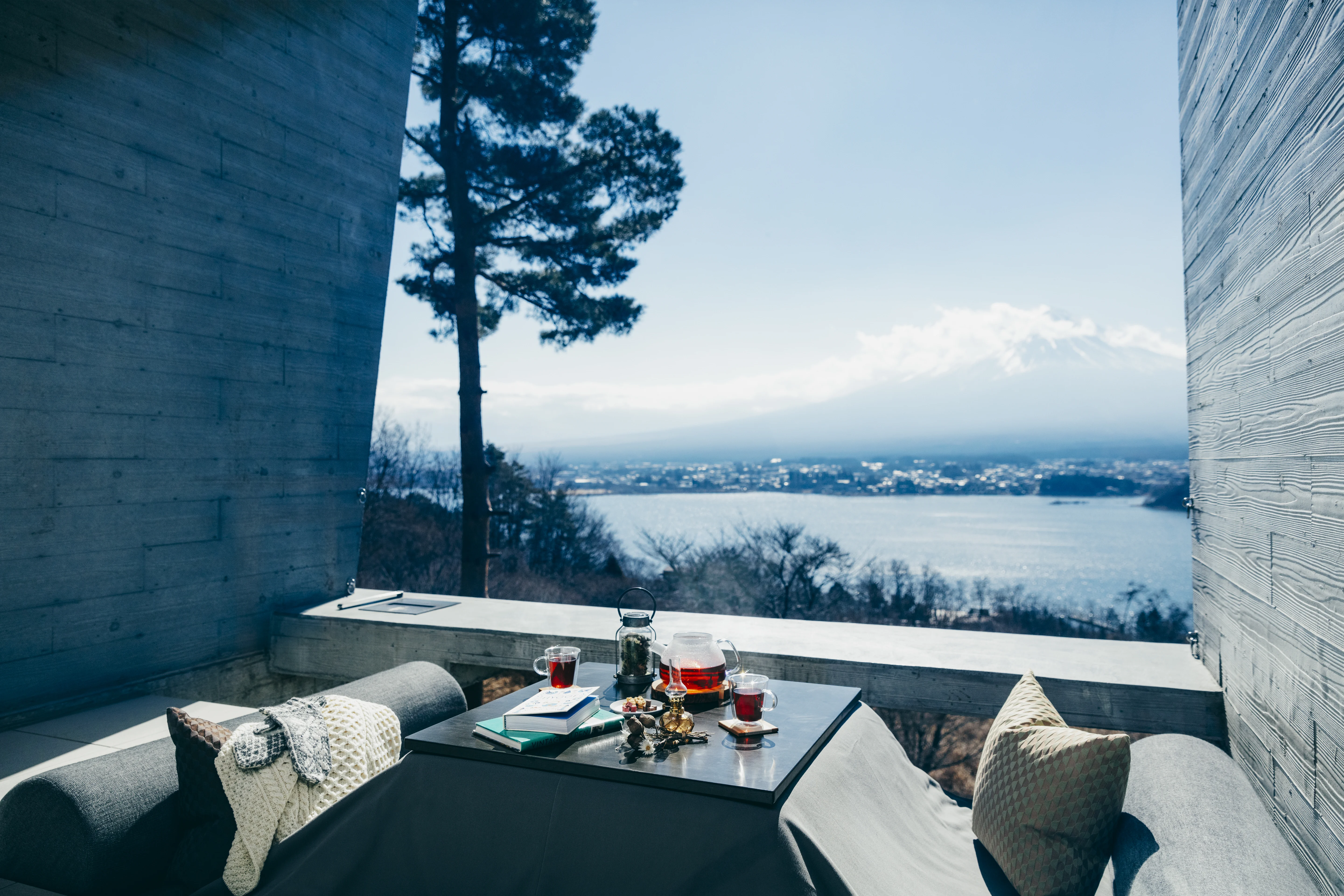 星のや富士では客室でも屋外を感じながら過ごせるよう、1/3のスペースをテラスリビングにし、ゆったりと足を伸ばせるソファやチェアを用意しています。風を感じるくつろぎのひとときをお過ごしいただけます。
