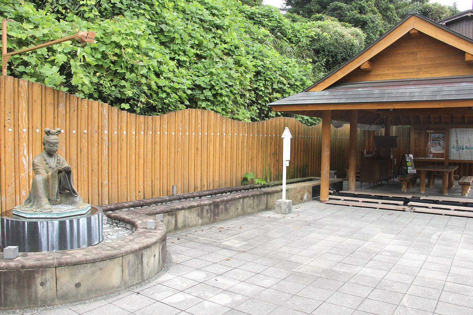 足湯の後は、広場のベンチでひと休み。美肌の湯のシンボル・姫神様の前にはカメラ台が置かれているので、旅の思い出に一緒に記念撮影はいかがでしょうか。