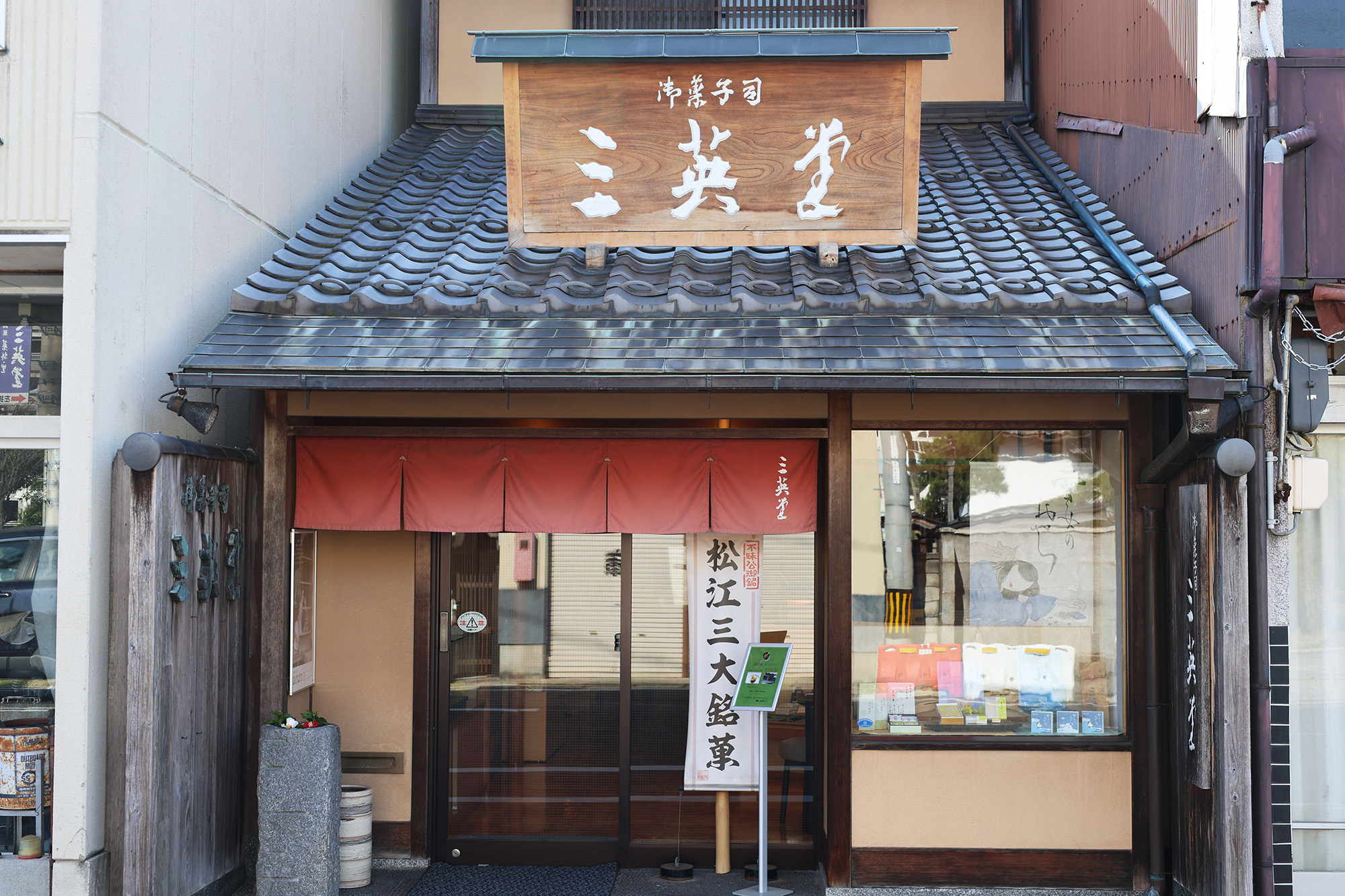JR松江駅から程近い寺町周辺は、歴史ある和菓子処が数多く軒を連ねるエリア。瓦屋根の古風な店構えが印象的な「三英堂」もその一角にあり、昭和初期に創業して以来、松江伝統の和菓子を今に伝えています。代表作は、「不昧公三大銘菓」のひとつである「菜種の里」。