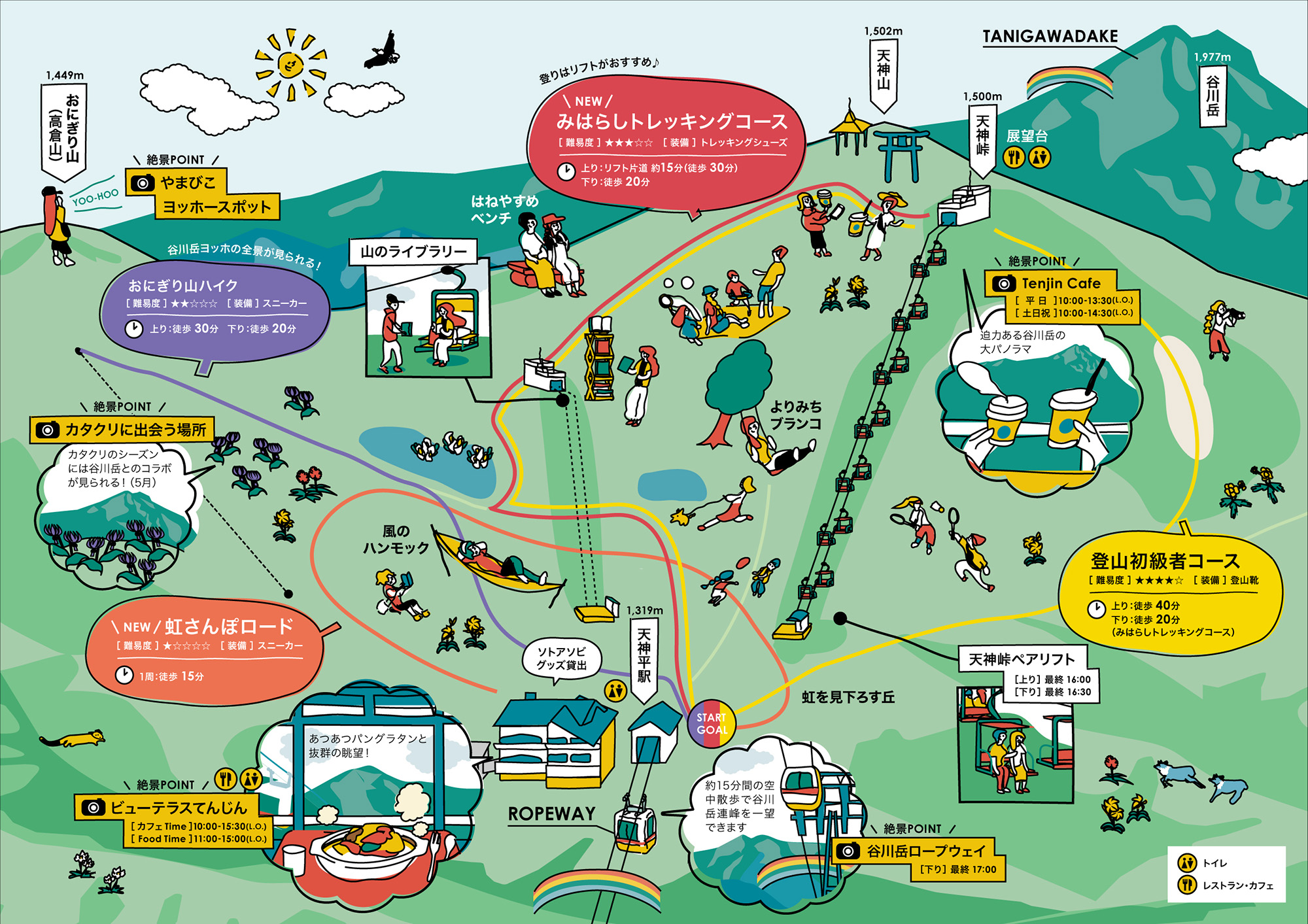 山麓から山頂へと移り変わる谷川岳の素晴らしい眺望と、ロープウェイやリフト乗車の非日常的な楽しさを組み合わせた半日プランです。「谷川岳ロープウェイ」は全長2,400mあり、山麓の「土合口駅」から「天神平駅」まで標高差約1,200mを約15分で上ります。「Tenjin Cafe」はテイクアウト式のカフェ。カジュアルな気分でドリンクや軽食をいただけます。