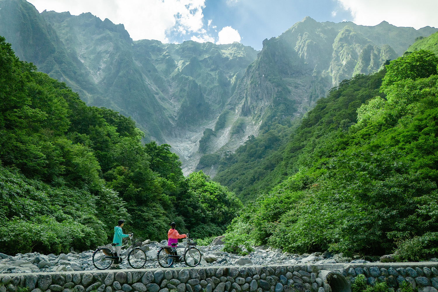 ブナ林を疾走する爽快感を味わえる、一ノ倉沢へのサイクリングは夏のおすすめアクティビティ。ロープウェイ山麓「土合口(どあいぐち)駅」にあるベースプラザで電動アシスト付き自転車のレンタルができます(事前インターネット予約制)。