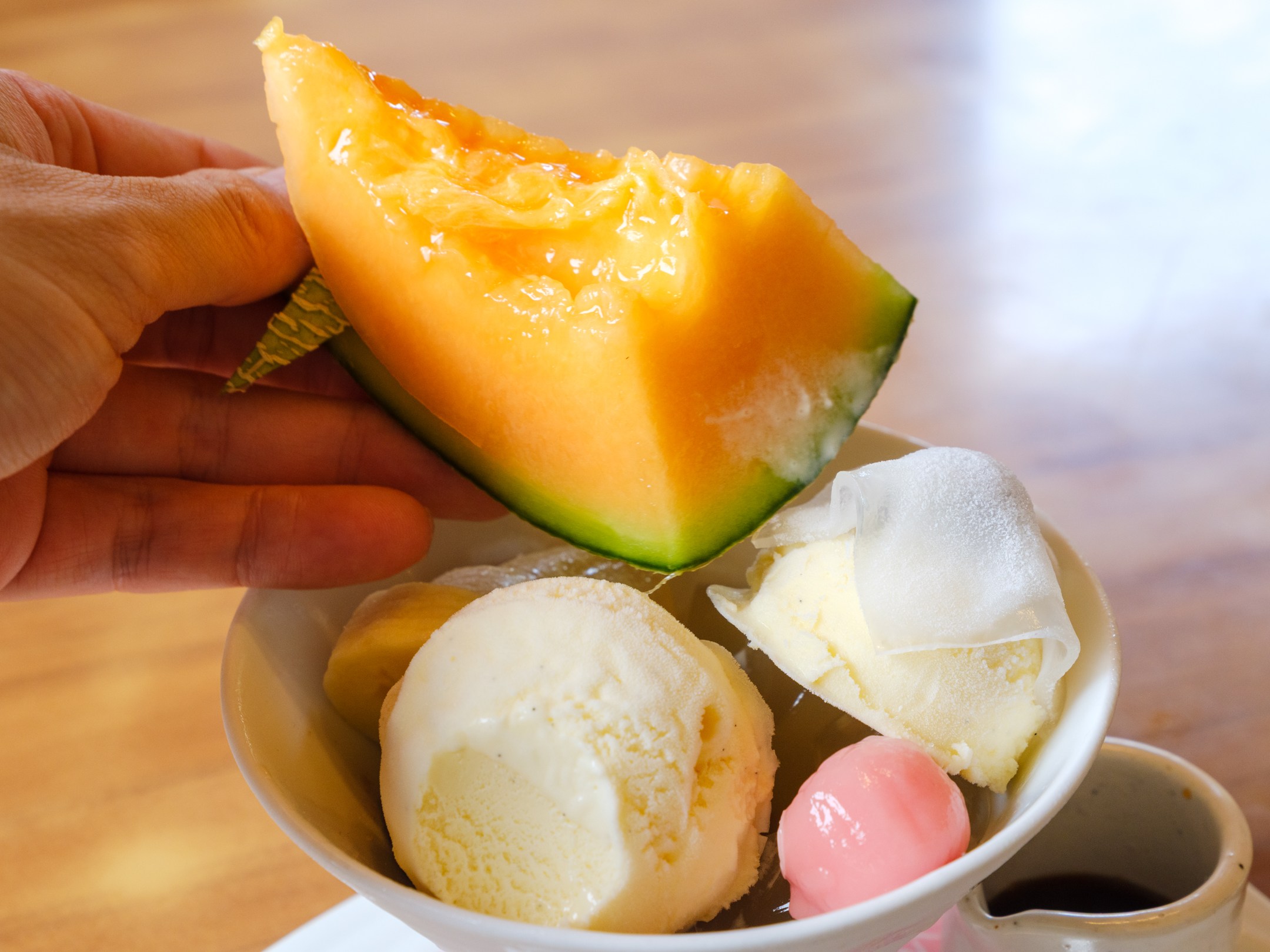メロン・マンゴー・イチゴなど、季節によってメインの食材はさまざま。この日は大ぶりのメロンが載っており、果肉が多くうれしくなります。