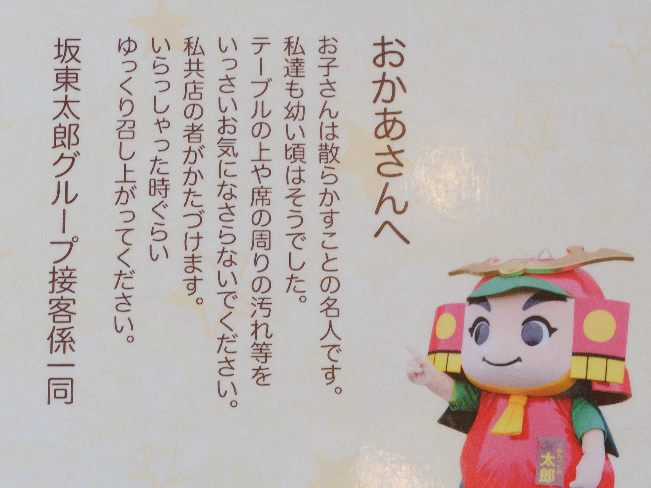 さらに、母親にありがたいのが「おかあさんへ」の文面。「お子さんは散らかすことの名人です」「テーブルの上や席の周りの汚れ等をいっさいお気になさらないでください」などと書かれ、子連れにうれしい心配りです。