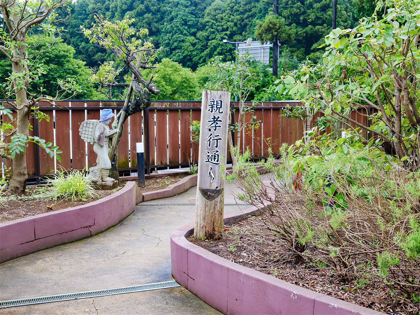 また、駐車場から玄関を結ぶ道は「親孝行通り」と命名されています。玄関に向かうにつれて狭くなるように設計され、すれ違う時に「譲り合う気持ち」に気づいてもらいたいと願いを込めたそう。