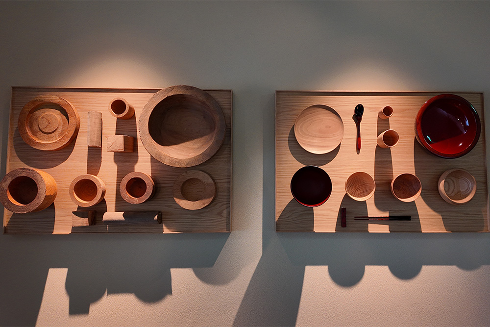 壁面を彩るモダンなアートは、かつて旅人が雨雪を凌ぐために使った「三度笠(さんどがさ)」や「引廻し合羽(ひきまわしがっぱ)」を表現しています。