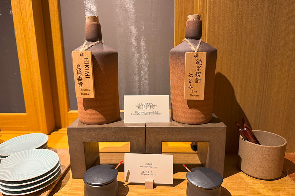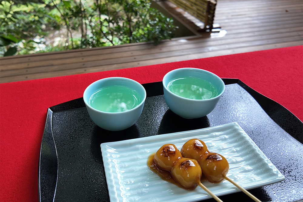 昼は、川のせせらぎと日差しに包まれる中、須雲川を望む席で季節のお茶とお団子をいただき、穏やかな時間を過ごせました。夜になると照明が落ち着いた雰囲気へと変わり、湯上がりにハーブティーや、箱根の薬草文化にゆかりのある焼酎を味わいながらリラックス。 静けさに包まれ、旅の余韻を味わえるひとときでした。