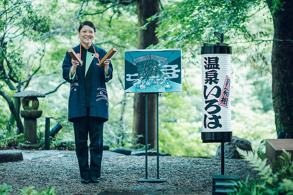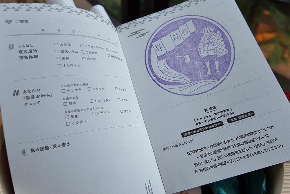 界では、「うるはし現代湯治」として、湯治の知恵を現代に活かすプログラムが充実しています。夕食前には、布に描かれたイラストで歴史や入浴法を学べる「温泉いろは」に参加。参加の証としてご当地のスタンプを押した「お湯印帳」がもらえます。