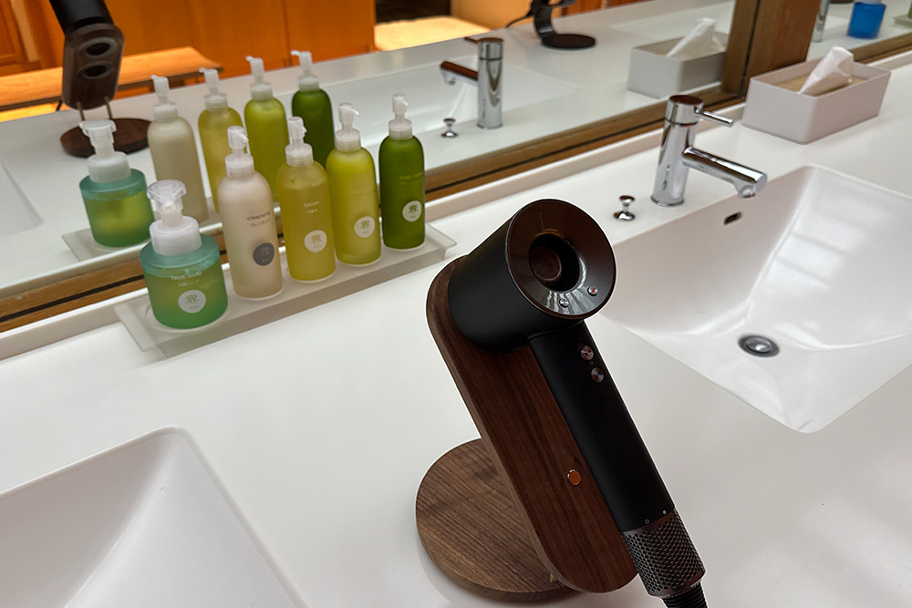 温泉好きにとって嬉しいのが、脱衣所にはバスタオルやフェイスタオルはもちろん、和漢生薬成分を用いた化粧水などのアメニティが一式完備されていること。客室から持ち出す必要がなく、思い立った時に「手ぶら」で何度でも温泉へ向かえます。