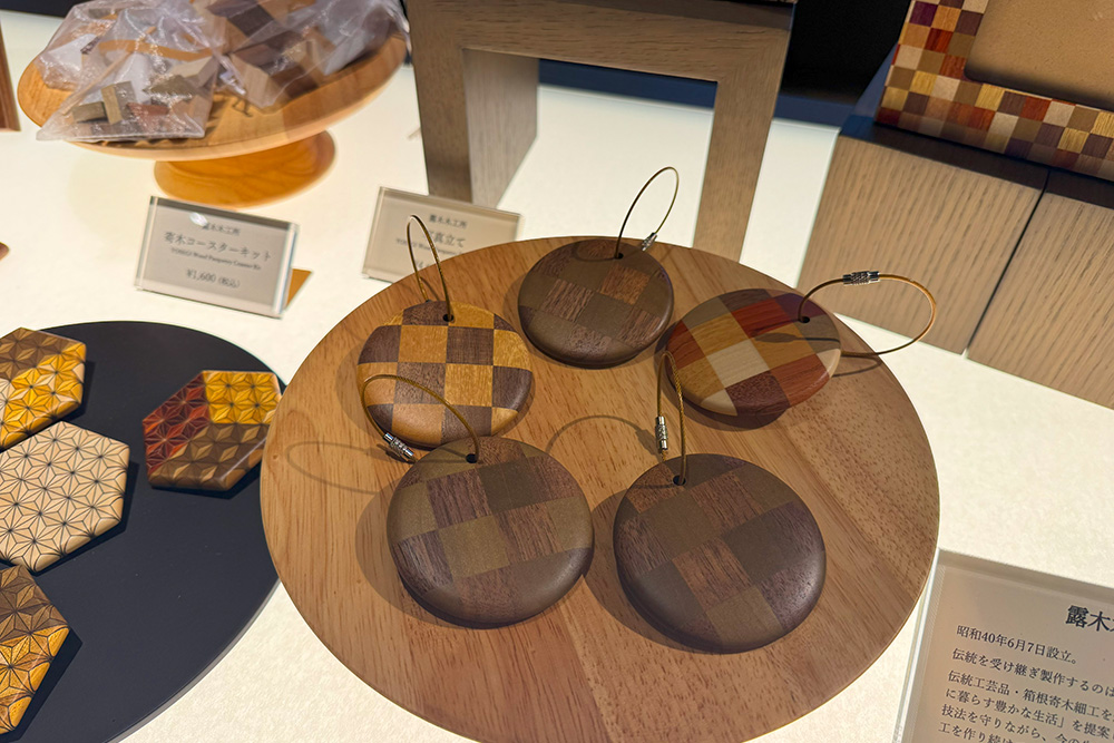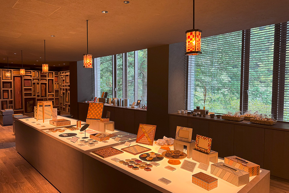 ご当地楽を体験した後は、併設のショップへ。寄木細工のグッズが豊富に揃っていて、体験の後だからか、ついつい手に取ってしまいます。ルームキーやティッシュケースなど、滞在中に客室で使用した商品も販売しているので、お気に入りのアイテムをお土産に購入できるのも嬉しいポイント。