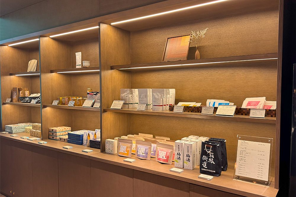 界 箱根オリジナルパッケージのお菓子や、お酒なども揃っています。