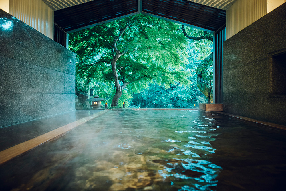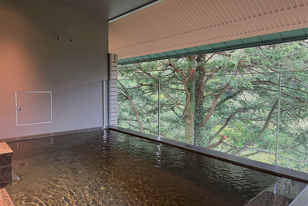 大浴場は、壁一面が切り取られた半露天風呂。目の前には風景画のような景色が広がり、湯坂山の緑と須雲川の清流とひと続きになったかのような開放感を味わいながらの湯浴みを楽しめます。