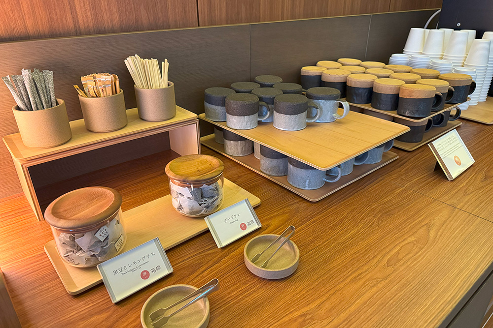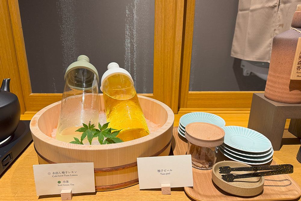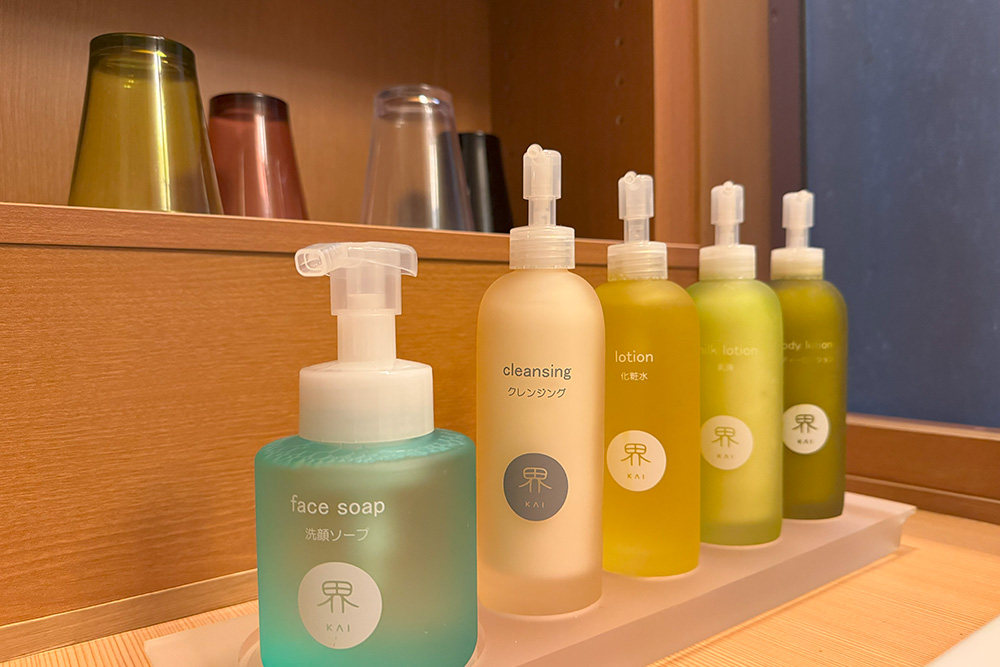 客室には細かなこだわりが感じられるアイテムが揃っています。手に取るたびに木の温もりを感じるルームキーやトレーは、伝統工芸・寄木細工のもの。アメニティも充実しており、和漢生薬成分のスキンケアセット完備で、身軽に宿泊できるのが魅力です。