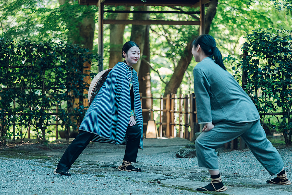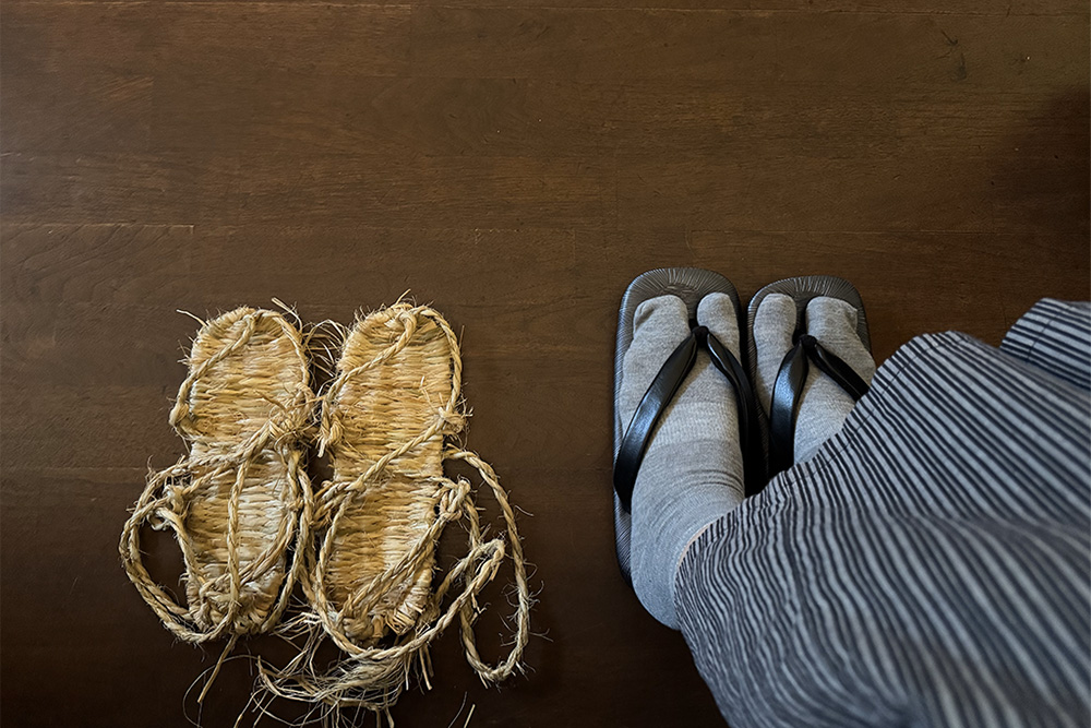 翌朝は、中庭で行う「現代湯治体操」に参加しました。実際にわらじを履いて足指を踏ん張る感覚は新鮮で、少し難しいのもご愛敬。東海道を行き交った旅人に思いを馳せながら、心地よく体を目覚めさせる貴重な時間でした。