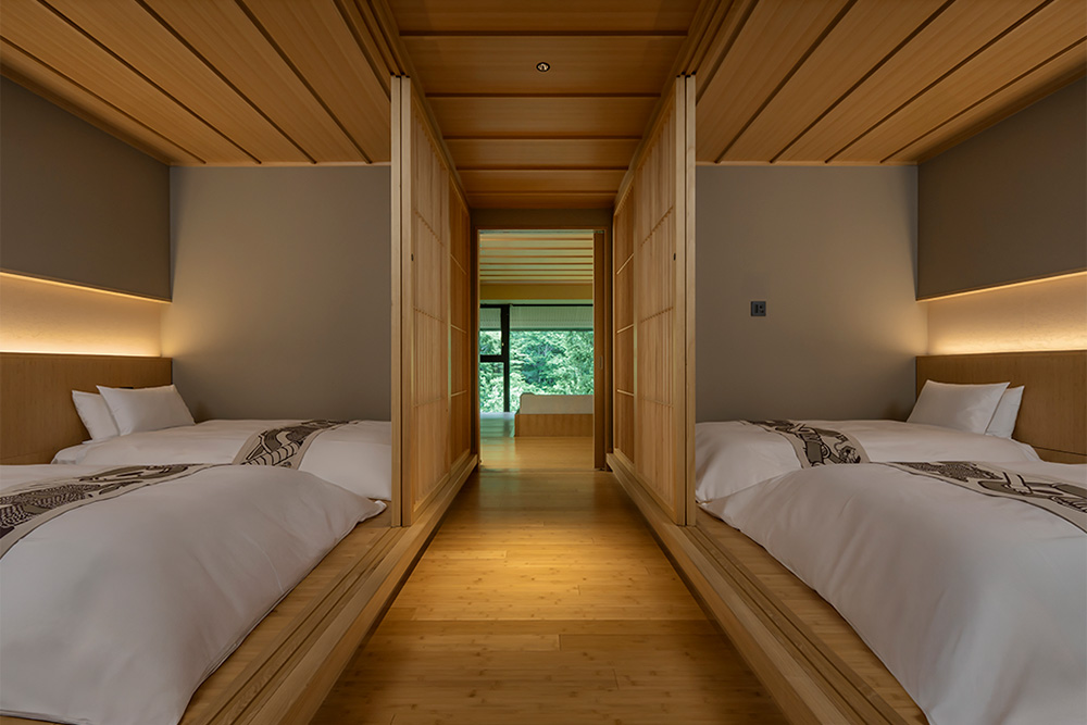 リビングで家族団欒のひとときを楽しんだ後は、ベッドルームで各々の時間を過ごせます。客室露天風呂や専用の湯上がりスペースもあり、いつでも気兼ねなく湯浴みが楽しめるのもポイント。
