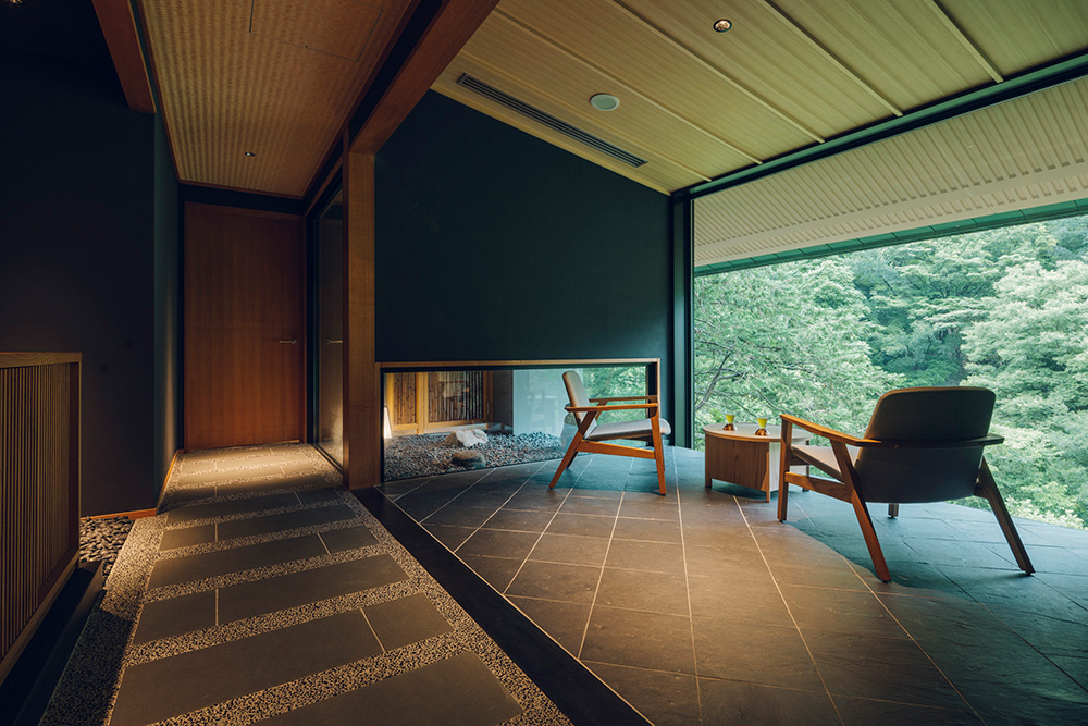 今回滞在したのは、清流・須雲川に面した和室。客室は、「東海道」をテーマにしています。広々としたリビングのソファに身を沈めると、窓いっぱいに広がる緑に包まれます。難所越えの歴史に思いを馳せつつ、現代の快適な宿で疲れを癒やす。そんな粋な「箱根ごこち」を存分に味わえる空間です。