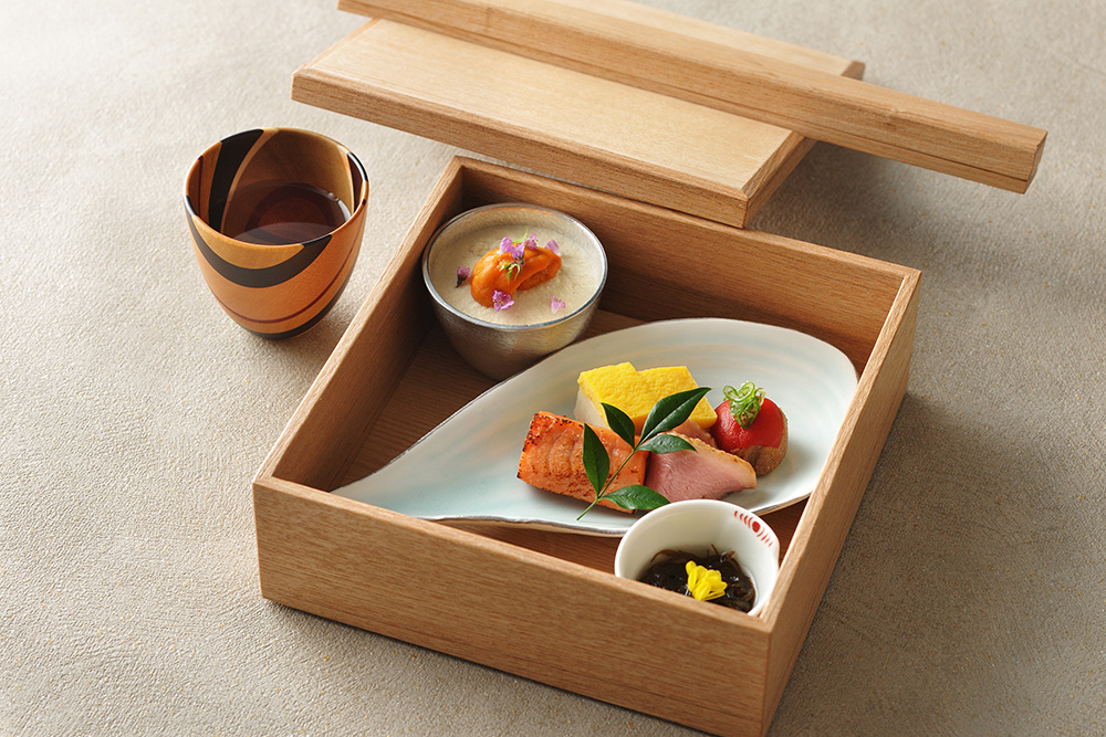 東海道の歴史にちなみ、かつて飛脚が使用した「はさみ箱」を模した器で先八寸を提供しています。実はこの器にはちょっとした仕掛けがあります。ぜひ実際に滞在して、体験してみてください。
