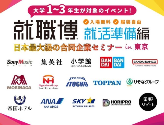 ■イベント名 『<1~3年生対象>就職博 就活準備編』 ■実施日程 東京会場:10月4日(土) 11:30~17:00 福岡会場:10月4日(土) 11:30~17:00