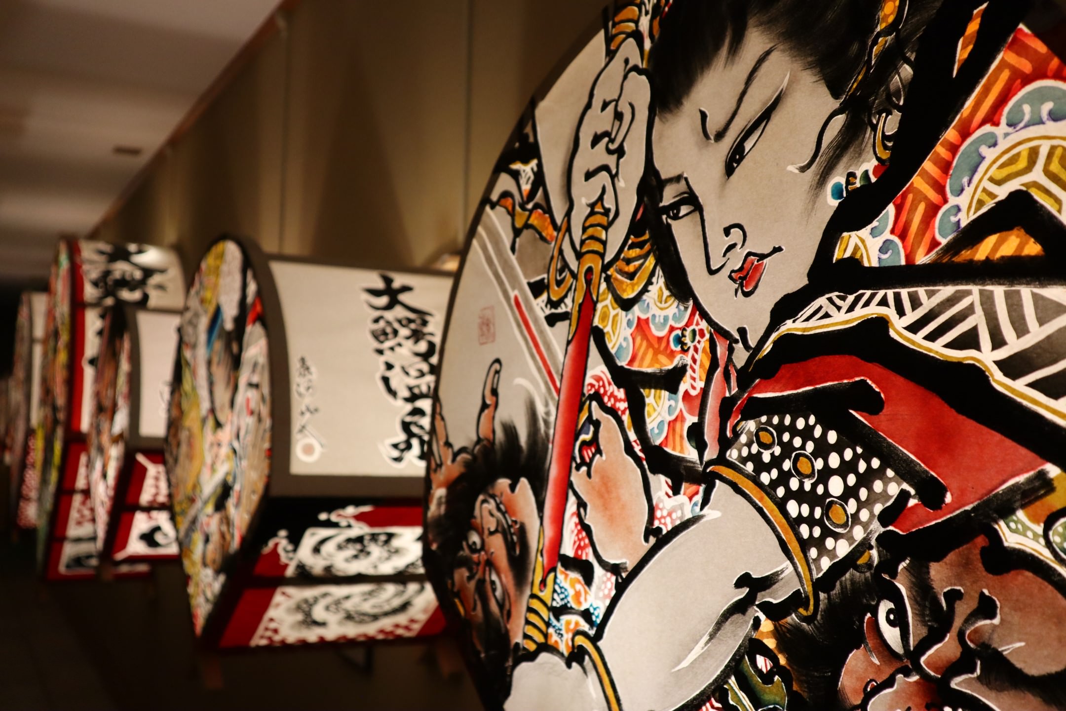 そのほかにも食事どころと繋がる道すがらや、客室棟に繋がる一部に扇形の小さいねぷたの実物を展示しています。また、季節によってはねぷたの絵付け体験や、実際のねぷたの絵を再利用してうちわを作るアクティビティを用意することもあります。