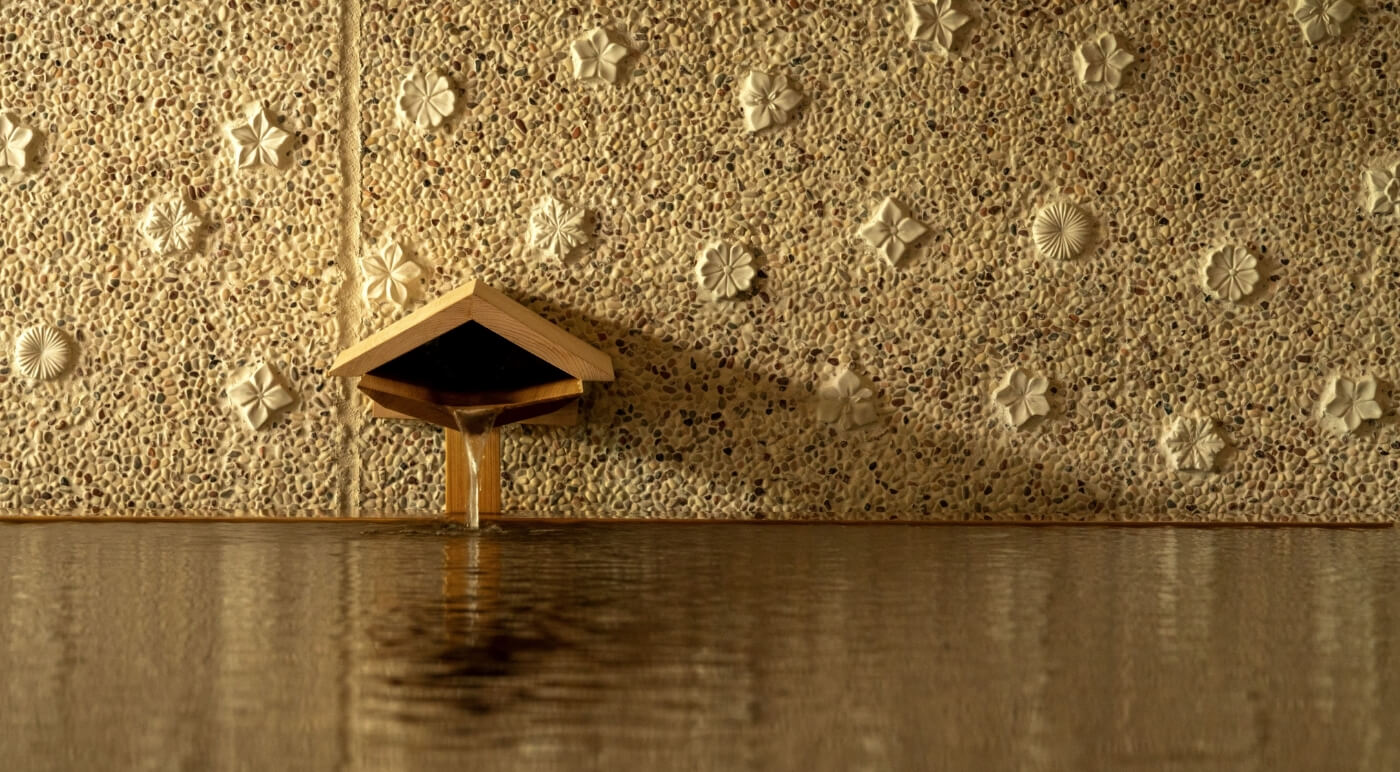 夕食の会席料理や、約400個の臼杵焼を埋め込んだ大浴場、