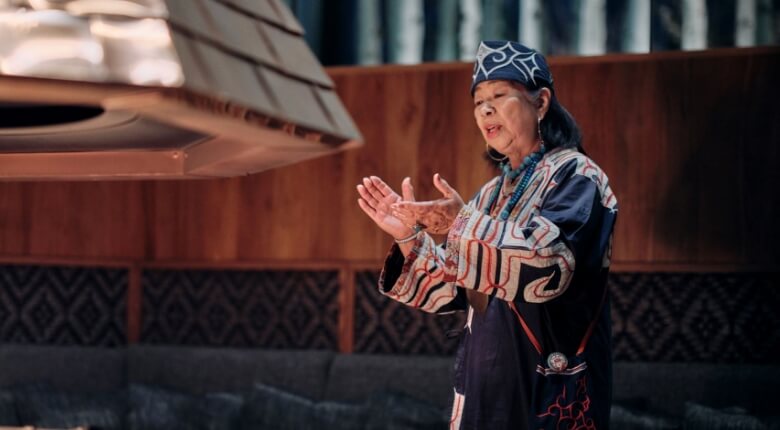 界ポロト館内のロビーにある暖炉で、アイヌ文化の伝承者である髙橋志保子さんから、アイヌ民族で受け継がれてきた歌「ウポポ」を教わります。髙橋さんも先人から、歌い継ぎで教わった歌。アイヌ語の意味や、歌われてきたシーンの解説をはさみつつ、パワフルな声量と独特の節回しで、お手本が披露されます。