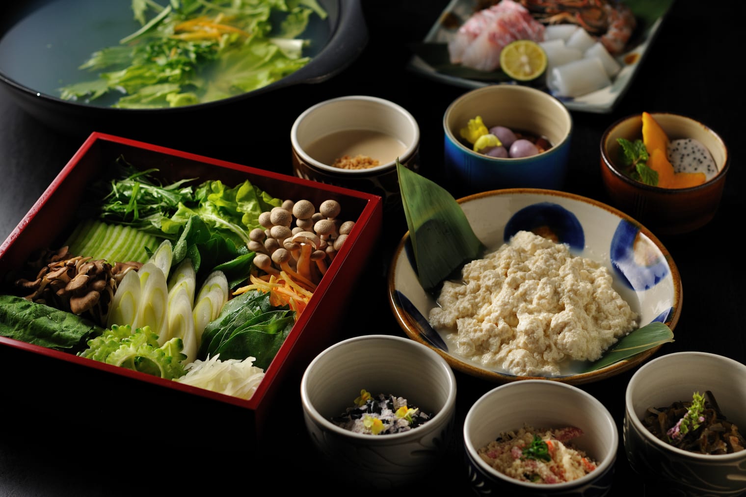 BLUE ZONE의 식사는 식물성 식품과 콩으로 구성되며 신선한 오키나와 채소로 만든 요리가 특징입니다. 조식으로 두부갈렛, 저녁으로 유시두부와 해물탕 나베를 즐길 수 있습니다.