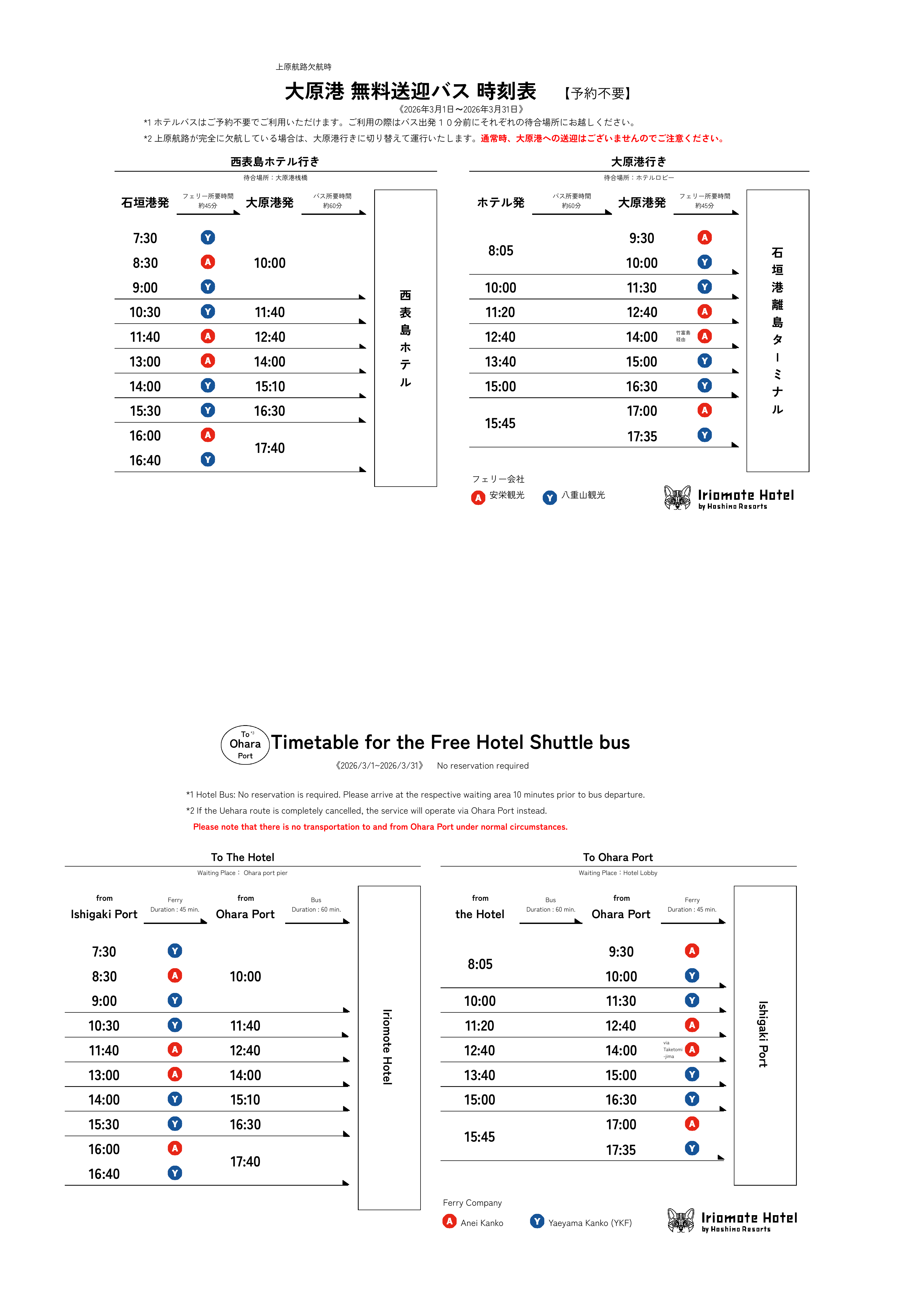 - ※기상악화 등으로 이시가키항∼ 이리오모테지마 우에하라항 항로 결항의 경우는, 오오하라 항으로 와주세요. 우에하라 항로 결항 시에는 오하라항에서 호텔 셔틀 버스 또는 각 선박회사의 송영 버스가 운행하고 있어요.