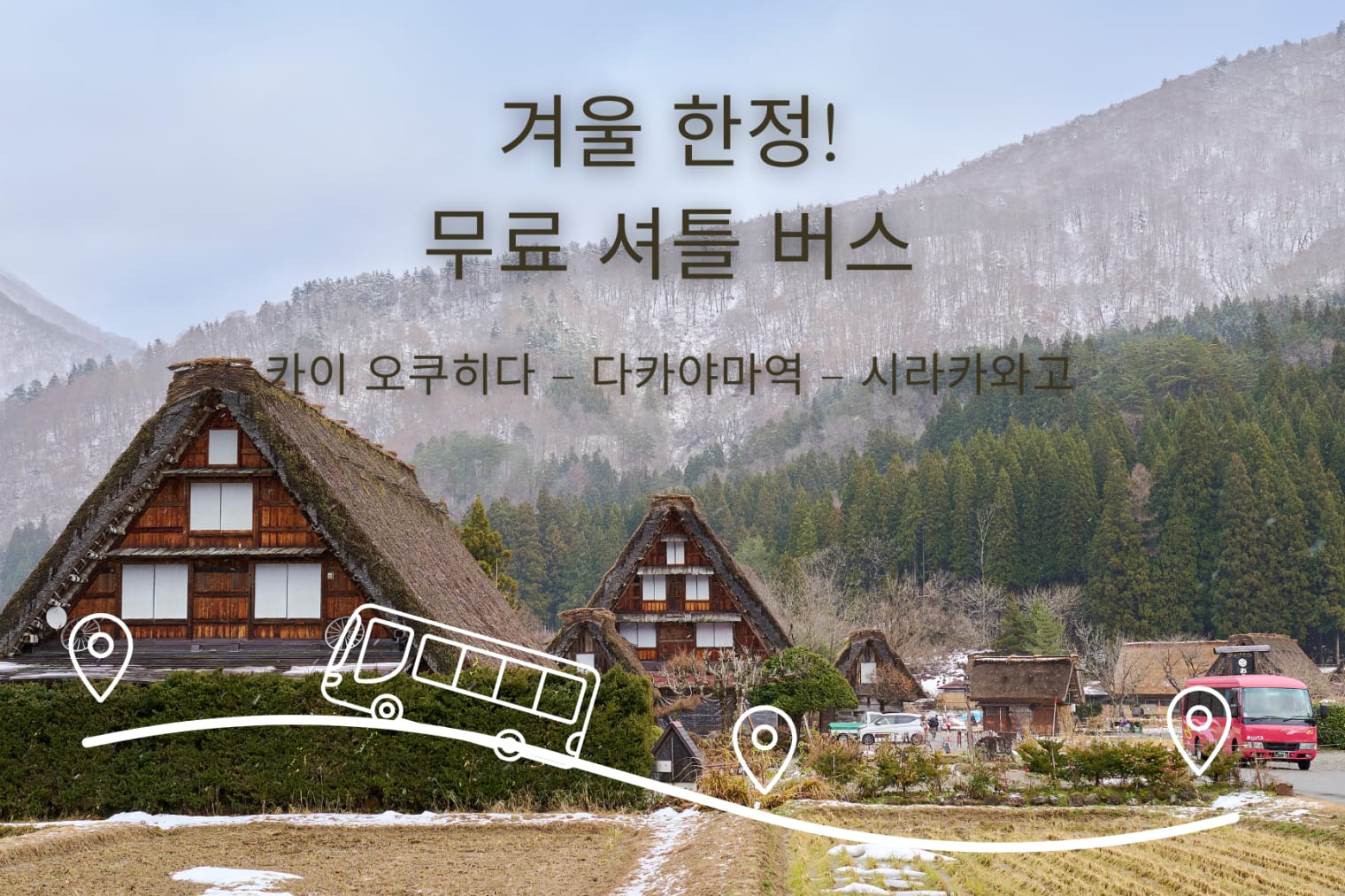 겨울 시즌 한정으로, KAI 오쿠히다, 다카야마 역, 시라카와고를 연결하는 무료 셔틀 서비스를 고객님들만을 위해 운영합니다. 좌석이 한정되어 있으니 미리 예약해 주시기 바랍니다.