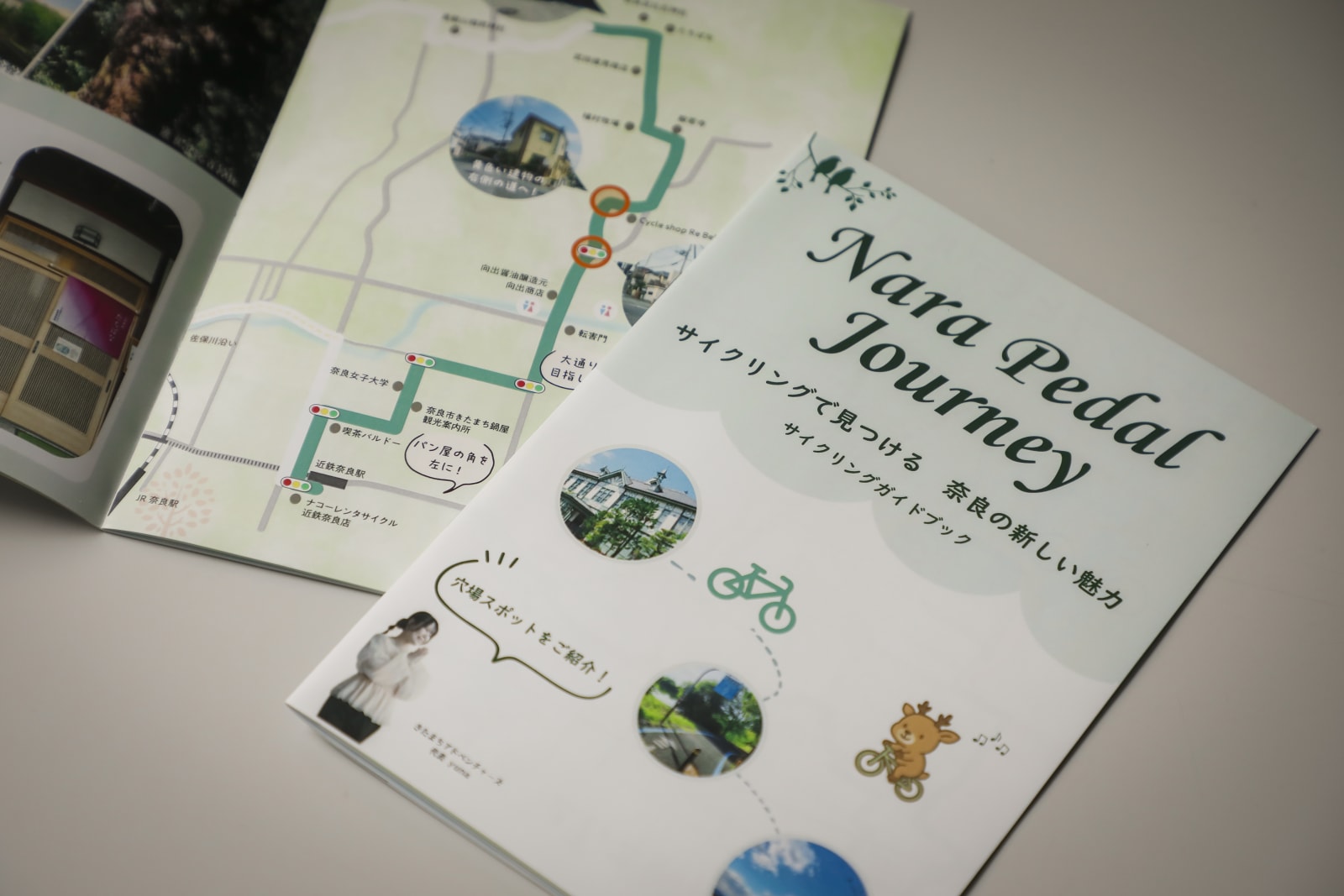 Kitamachi Adventures consists of four members, including Akari Watanabe (on the left) and Yuna Kato (on the right) from Nara Women’s University. Having completed their first cycling guidebook, Nara Pedal Journey, their next goal is to create a new version for international visitors. Watanabe’s favorite Kitamachi spot is Hannyaji Temple, while Kato’s is Naramahiko Shrine.