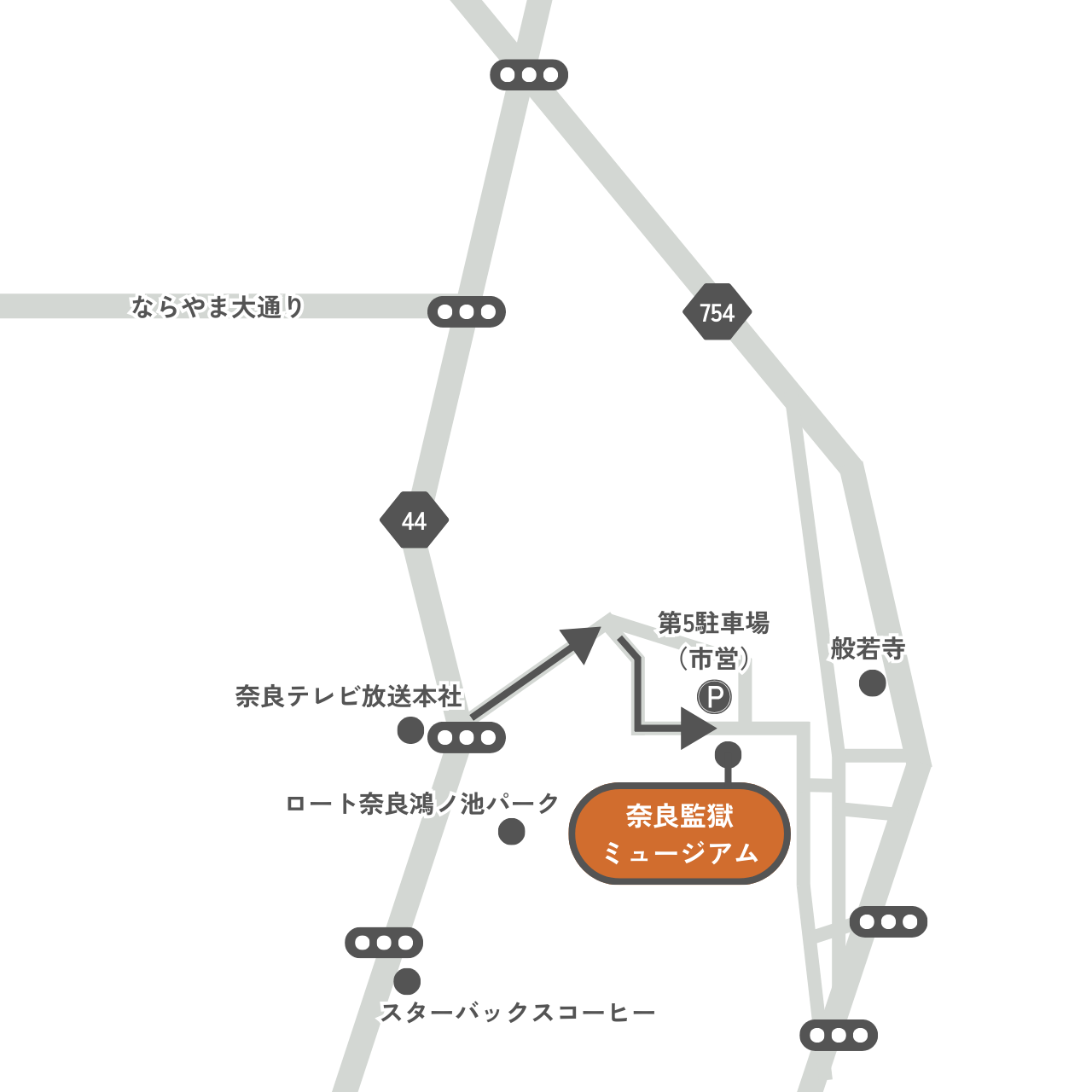 「奈良テレビ放送本社ビル」を目印に県道44号線をお進みください。