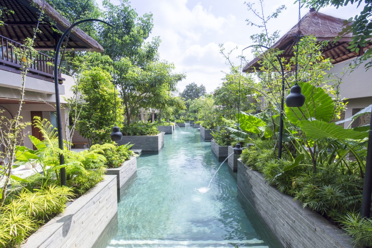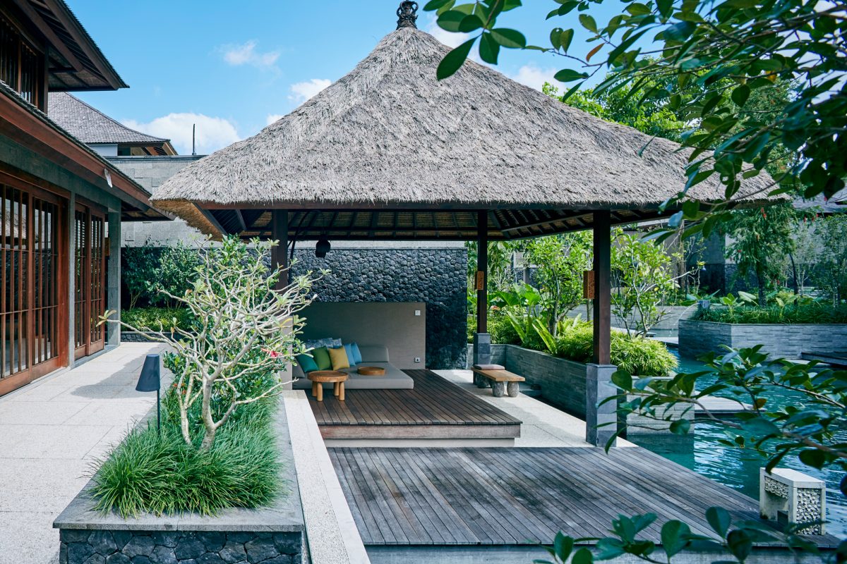 巴厘岛建筑崇尚人、自然、神之间的和谐共生。在虹夕诺雅 巴厘岛,受惠于流淌着神圣泉水的帕克里桑河以及保护当地自然景观的水利系统“苏巴克 (Subak)”,庭园被设计为清泉环绕的景观。从别墅的私人领域到开阔的泳池,再到整个村落与周边的自然秘境,空间在流水的引导下舒缓地交织相连。