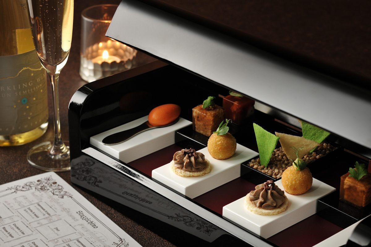 晚餐提供旨在实现与信州葡萄酒完美“联姻”的正宗意式套餐。信州松本拥有桔梗之原(Kikyogahara)葡萄酒谷等著名产区,是日本葡萄酒的核心产地。信州葡萄酒以口感纯净、果味灵动见长。为了不掩盖其轻盈的余韵,厨师摒弃了浓重堆叠的酱汁,转而采用橄榄油的清爽作为连接,通过意式烹饪极致追求味蕾体验。首道名为“Stuzzichini(餐前小点)”的料理将盛装在以钢琴为灵感的特制器皿中呈献。在音乐术语中,“Elegante”代表优雅的曲风,这道以钢琴为主题的开胃菜,正是对这一主题的完美诠释。